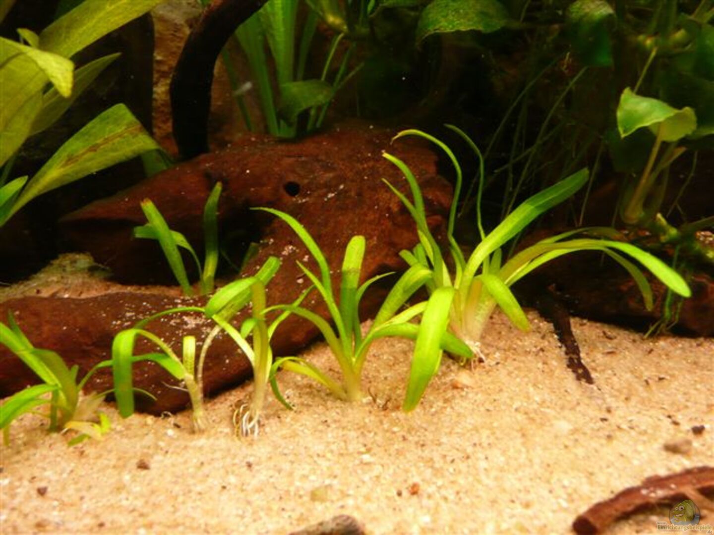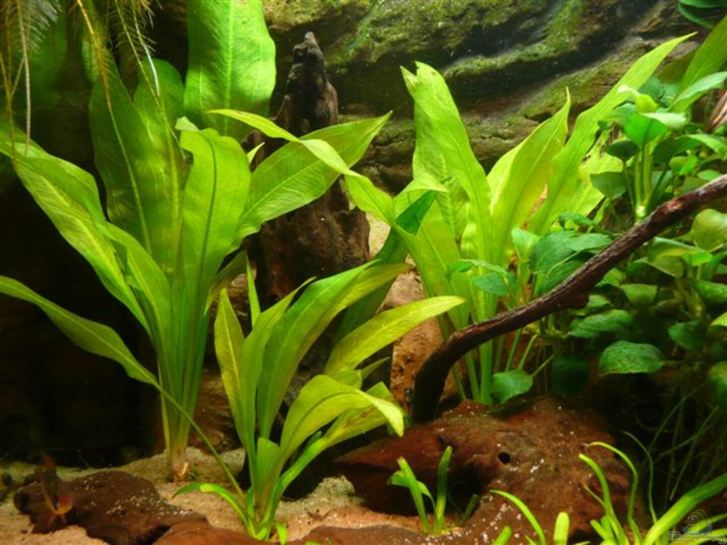 Bei den Pflanzen sollen Echinodorus bleheri den Hauptanteil stellen. Muschelblumen als Schwimmpflanzen sollen das Licht dämpfen und den Fischen als Unterschlupf dienen. Das Javamoss soll allmählich von der Rückwandoberseite nach unten ins Becken wachsen.