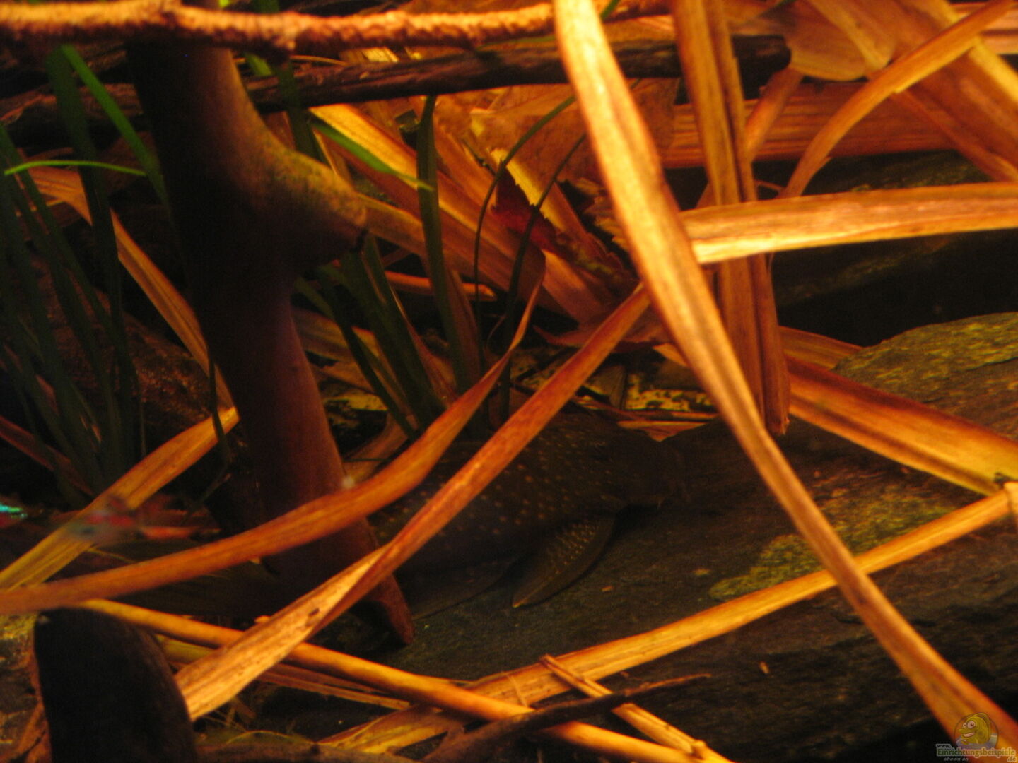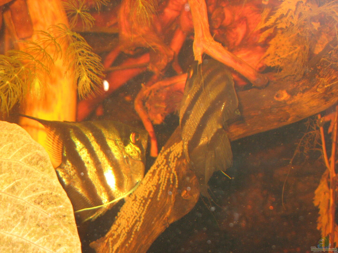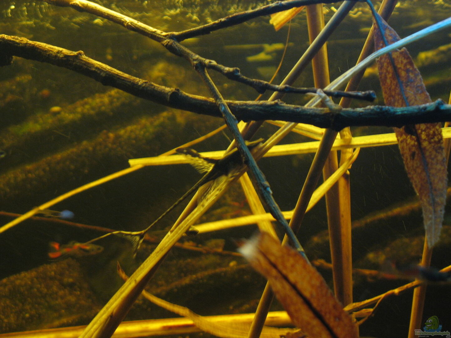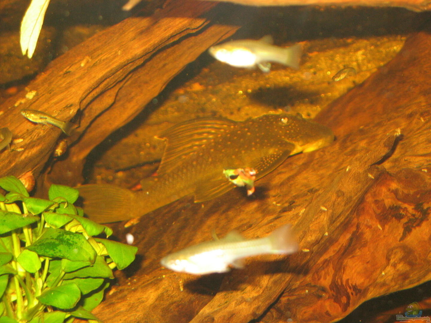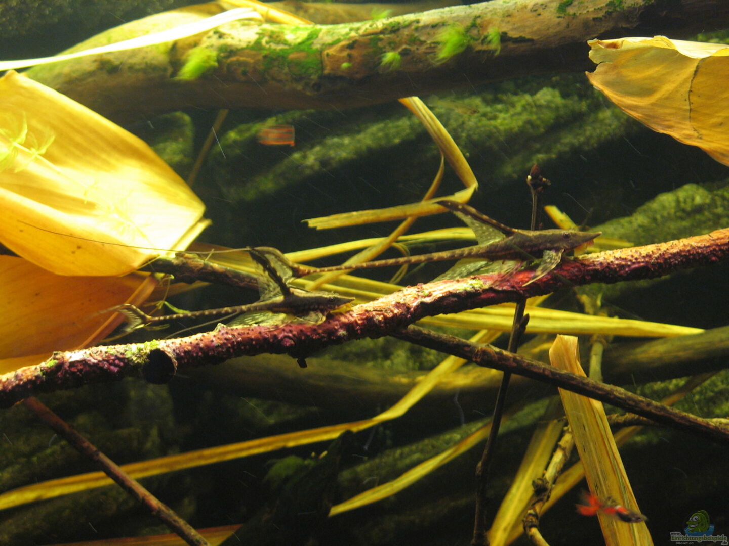 4 sturisoma aureum. Ich gehe zum jetzigen Zeitpunkt mal davon aus, dass es die echten "aureum" sind. Momantan sind diese ca. 7-9 cm lang (ohne Schwanzflossenfilamente). Leider hat sich hier ein Tier mit verkrüppelten Brustflossen eingeschlichen. Dies fiel mir beim Kauf nicht auf. Ich werde das Tier aber behalten, zumal es das grö??te ist und auch das bis jetzt am schönsten ausgefärbte. Ich kann jetzt schon sagen, dass diese Tiere in der Tat strömungsliebend sind. Am liebsten halten sie sich auf den langen Holzästen in der Strömung auf und weiden diese ständig ab. Die skurrile Form und das muntere Treiben -auch tagsüber- machen diese Tiere zu einer wahren Augnweide. es macht einfach Spa??, die Tieres beim Raspeln zu beobachten. Mal hocken Sie alle dicht beisammen, mal sind sie querbeet im Becken verteilt. Was das Futter anbelangt, werde ich die Vorlieben noch genauer herausfinden müssen, kann aber sagen, dass sie bis dato am liebsten die Scheiben ablutschen und Holz beraspeln. Im Gegenssatz zu den Panaquolus sind momentan die Sturisoma die wahren Holzraspler. Sie lieben die immer mal wieder frisch eigebrachten Zweige.