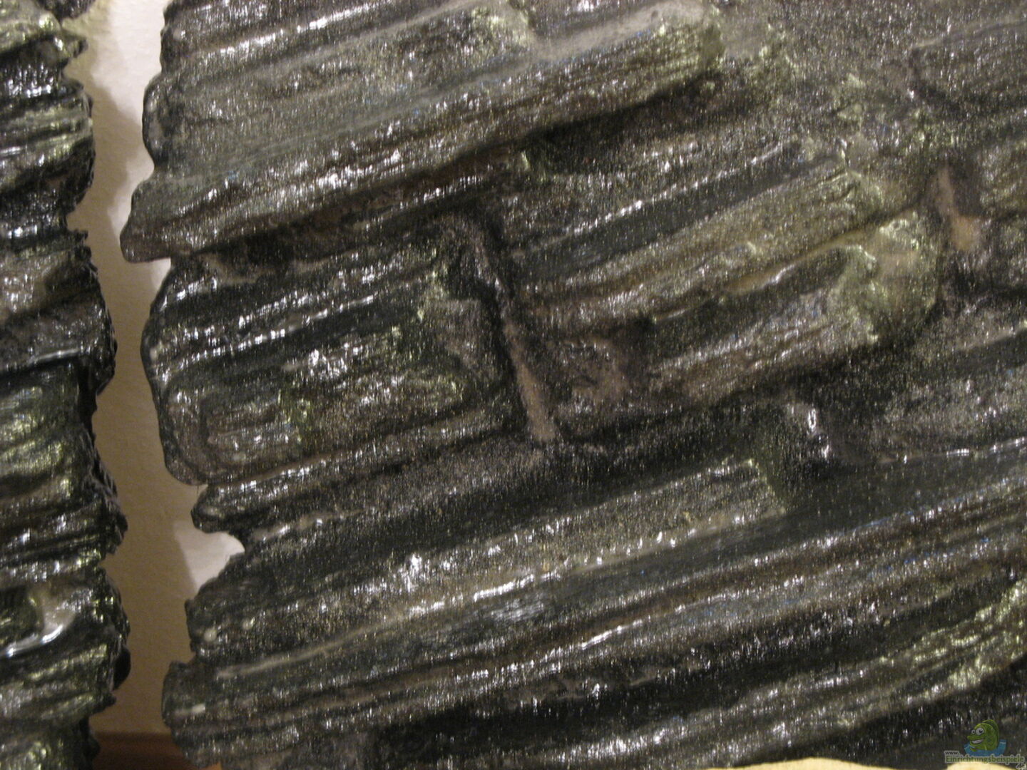 Nachdem ich während eines Urlaubes in ??sterreich bei einer Wanderung in den Rauriser Bergen wieder einmal mehr von den Gesteinsformationen beeindruckt war, keimte in mir die Idee, ein Biotop zu gestalten, das in erster Linie durch dunkles Gestein in Schieferoptik dominiert wird. Ich denke mal, dass dies durchaus auch so in der Natur im nördlichen Südamerika vorkommen kann. Es sollten sich die Muster in den Gesteinsformationen schräg entlang der Rückwand von rechts oben nach links unten ziehen. Da ich mir die Deko lieber selbst bastle als zu kaufen, wurden 3 Rückwandmodule gefertigt. Sie wurden einfach in den Bodengrund gedrückt und somit zwischen Boden und Seitensteg eingeklemmt. Der Bodengrund selbst sollte natürlich ebenfalls dunkel gehalten werden. Auf dem Beckenboden wurde dann noch ein modifizierter gekaufter Felsen als Bodengrundmodul gelegt. Des weiteren befinden sich noch gekaufte Schieferstücke (Firma Orbit) im Becken, deren Farbwirkung nahezu zu 100% mit den selbst gebauten Modulen übereinstimmt.