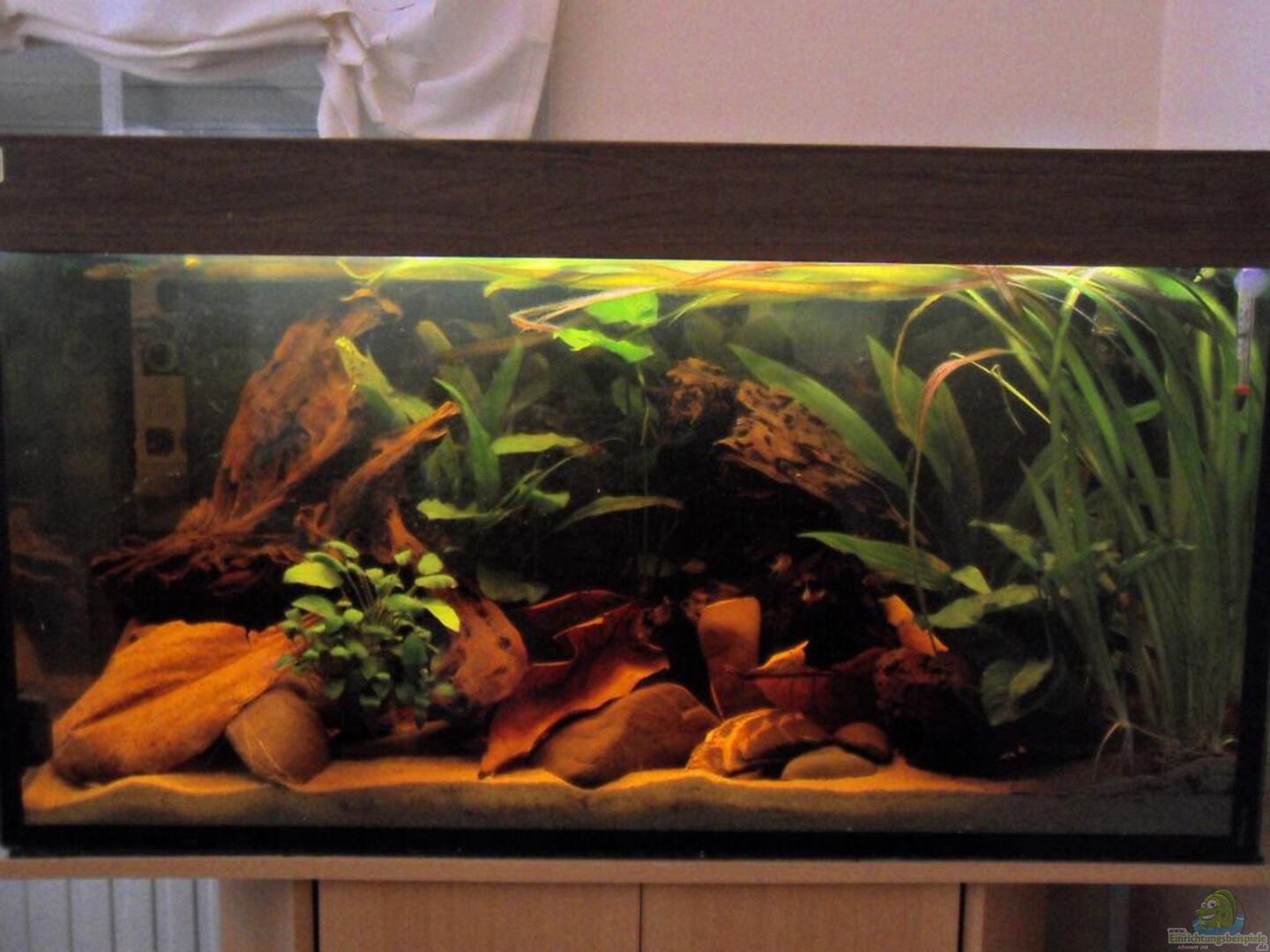 Das Becken wird als Gruppenprojekt in meiner Wohnung geführt in der sich wie oben schon genannt eine Gruppe Microgeophagus ramirezi tummelt. Leider wurden aus dem ursprünglich geplanten Besatz von 2M/4W dann 1M/5W, da sich nach einigen Tagen ein vermeintliches Männchen doch als Weibchen herauskristallisiert hat. Du Gruppenhaltung funktioniert reibungslos und absolut ohne Probleme. Alle Tiere wurden am gleichen Tag eingesetzt und somit hatte jedes Tier die gleichen Startvoraussetzungen. Kein Tier wird unterdrückt oder ausgegrenzt, es gibt lediglich kleine Reibereien innerhalb der Gruppe aber diese sind so schnell vorbei wie sie gekommen sind. Es ist sogar annäherndes Schwarmverhalten zu beobachten. So zieht die gesamte(!) Gruppe miteinander durchs Becken und Sucht das Substrat nach fressbarem ab ohne das es nur den geringsten Stress gibt.