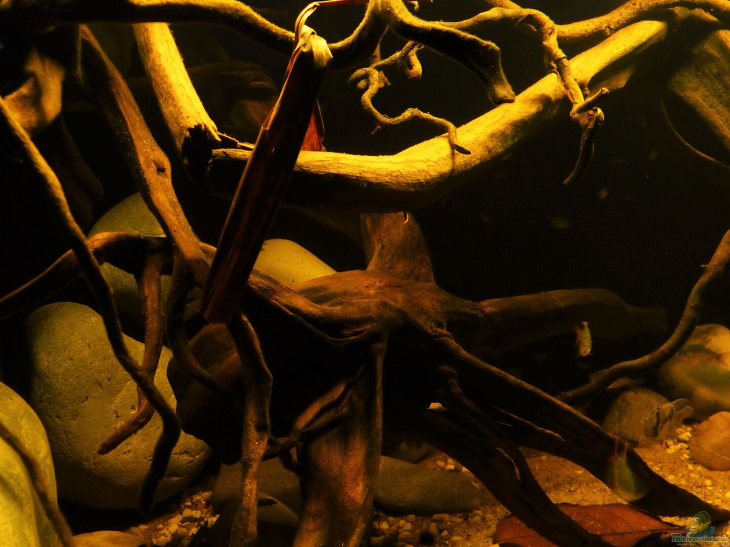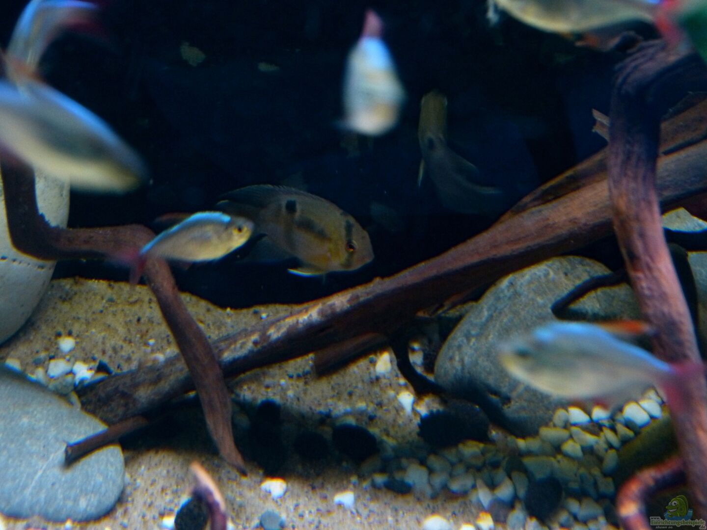 Ein Gebirgsharnischwels ist eingezogen und die Tüpfelbuntbarsche sind ausgezogen, weil sie von den Maroni-Buntbarschen stark unterdrückt wurden.