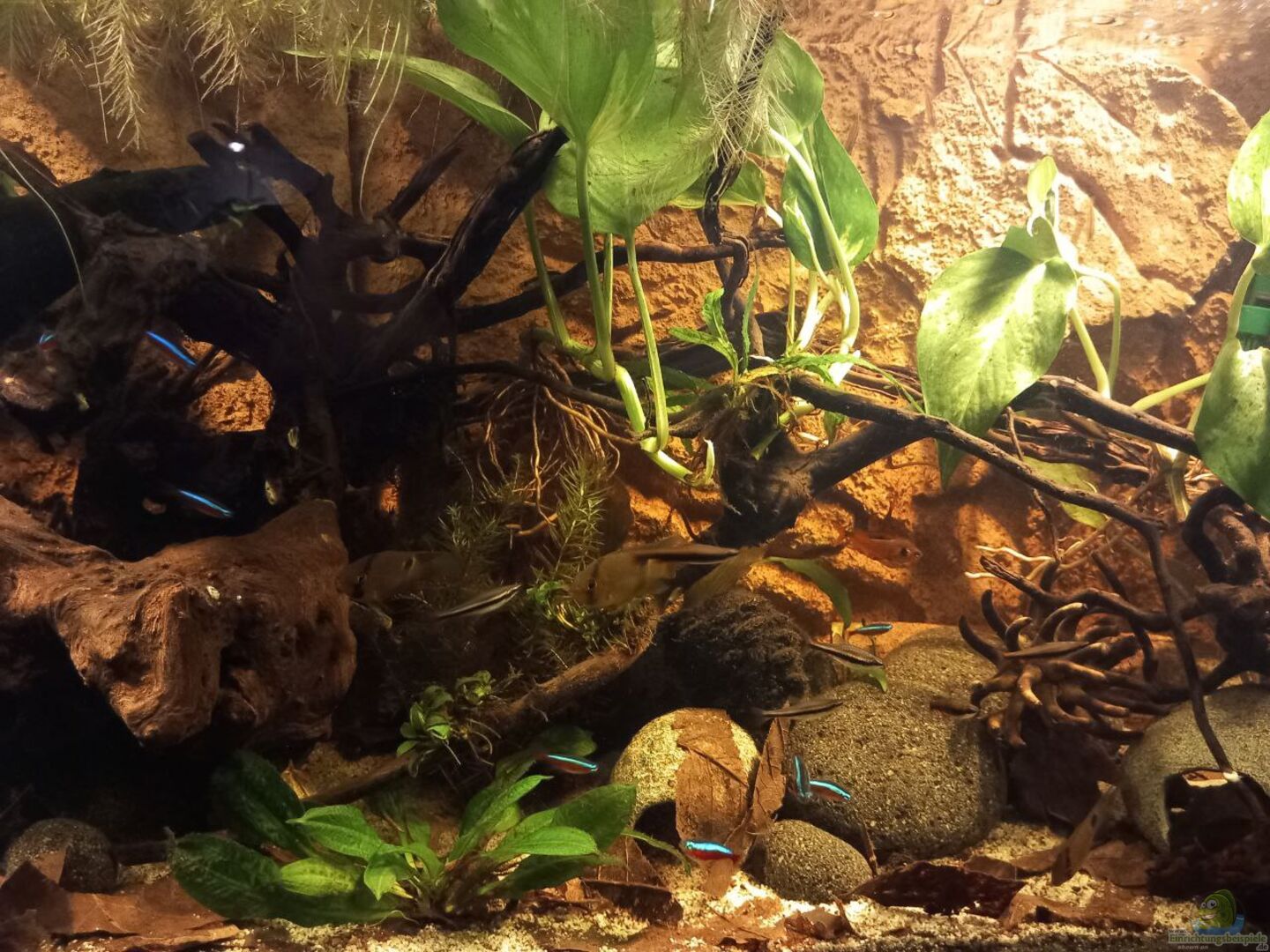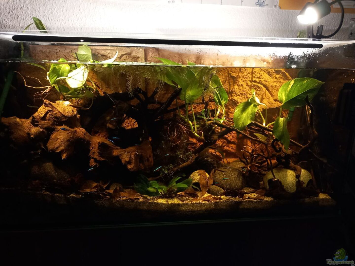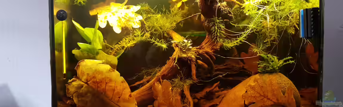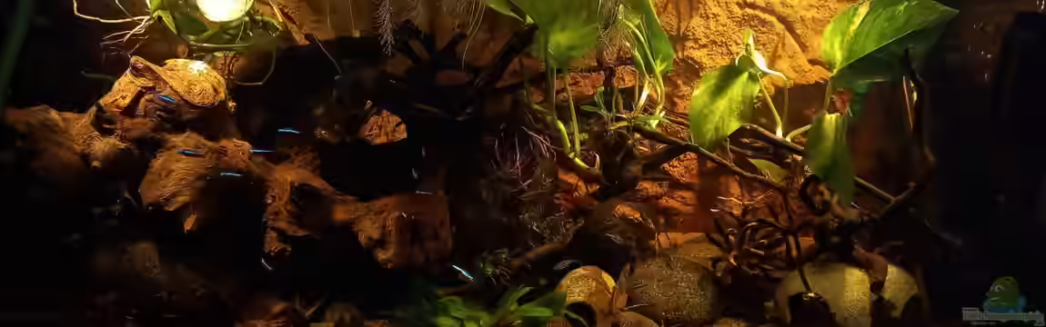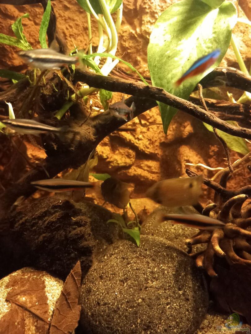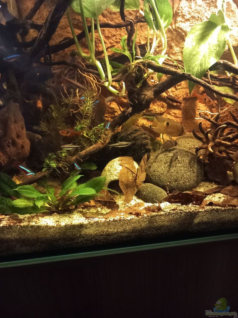Einziger Verbesserungsvorschlag auf dem ersten Blick: Ich würde das Becken ganz mit Wasser befüllen und die Anubien passen nicht so recht zum Biotop, aber beides ist jetzt nichts, worunter die Tiere leiden würden.