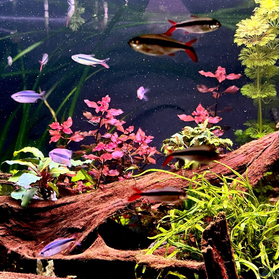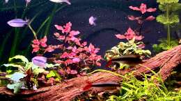 Mehrere Teilwasserwechsel mit aufgesalzenem Osmosewasser lösten das Problem. Mit dem steigenden Pflanzenwuchs traten die Algen immer mehr in den Hintergrund.