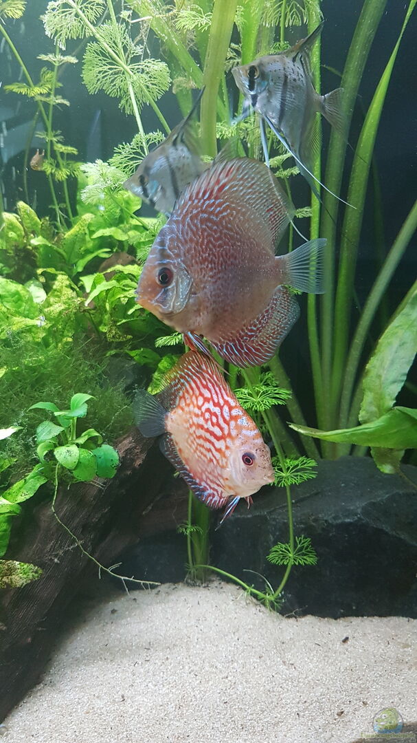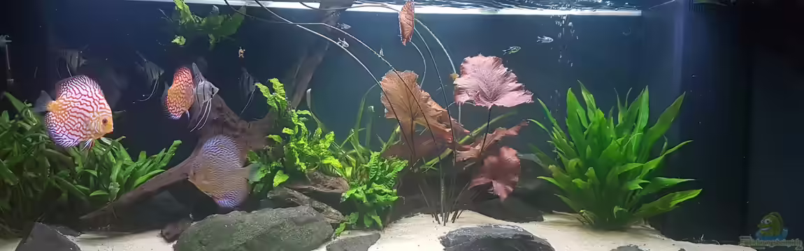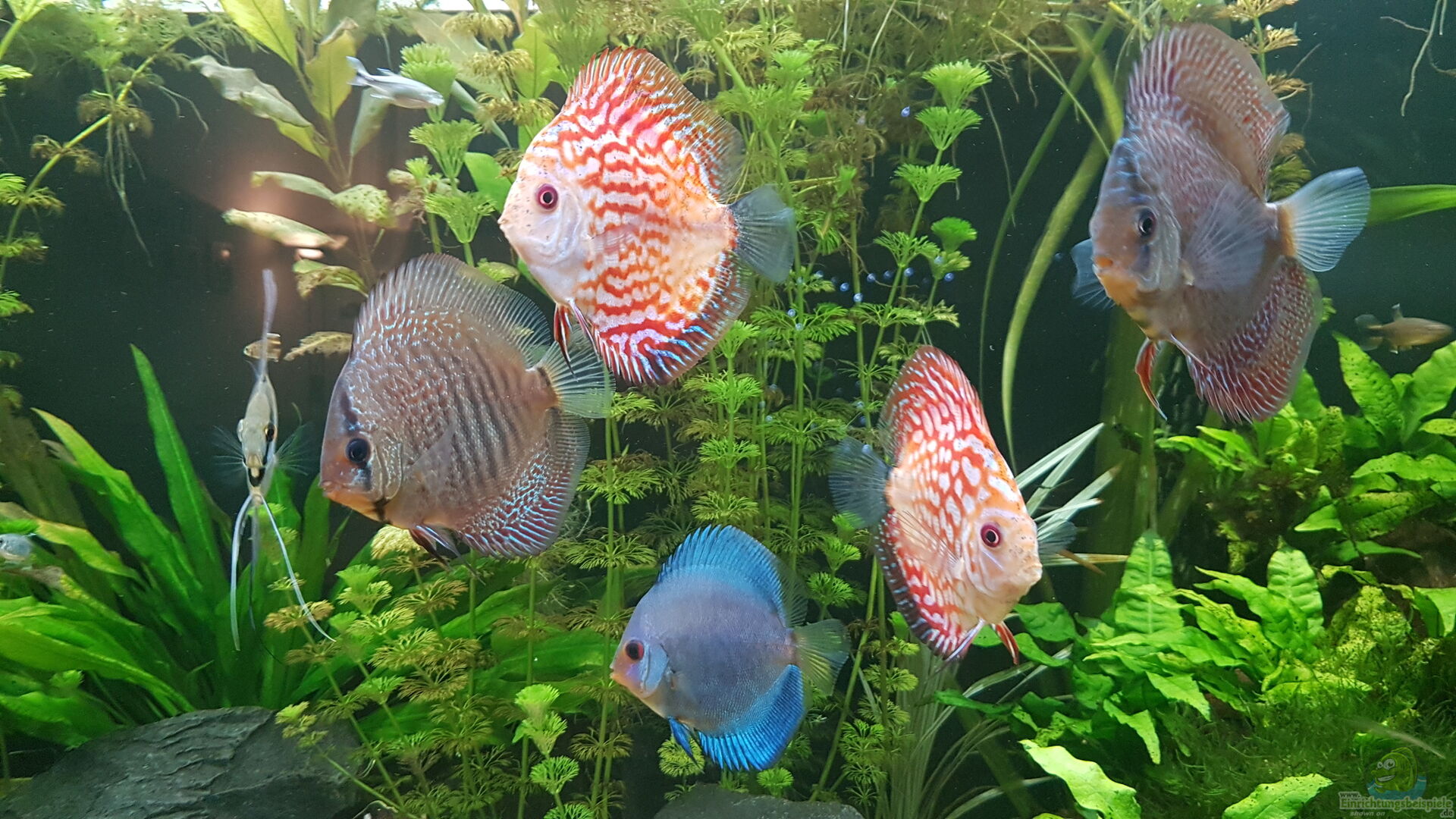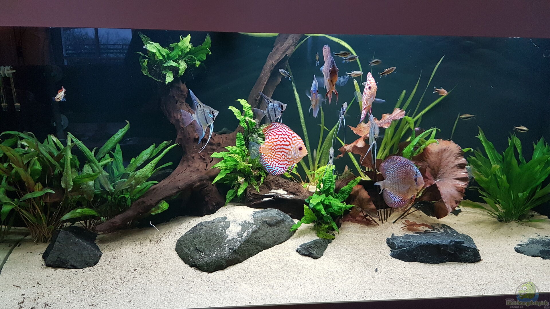 Optisch ist das wirklich ein Leckerbissen. Die Einrichtung ist die sehr schön gelungen. Beim Besatz finde ich, dass 4 Diskus fast ein wenig zu wenig sind. Ich denke, dass eine grö?ere Gruppe besser wäre, wobei ich da so oder so nicht sicher bin, ob die mit den Skalaren wirklich funktionieren.