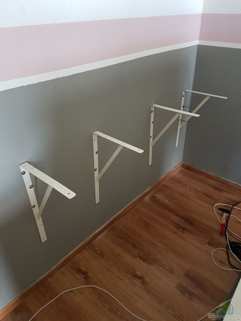 Mit 4 Schwerlastkonsolen erhoffe ich mir das ein grö??erer Teil des Gewichtes vom Aquarium auf die dahinterstehende Tragende Wand übertragen wird. Grund dafür ... Das Becken Steht im 3 Stock einer Altbauwohnung. Die Rückseite und Rechte Seitenscheibe wurden von Au??en mit Schwarzer Farbe angestrichen.