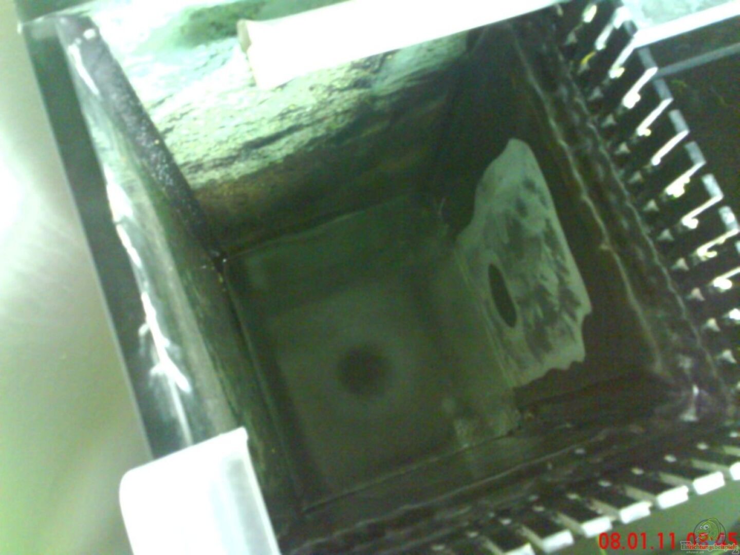 Gefiltert wird im Filterbecken mit HMF Grob als Vorfilter welches weiter durch HMF Fein zur JBL Filterwatte gelangt.Als groben Schmutzfänger habe ich den ??berlaufschacht ebenfalls mit einer HMF matte grob verkleidet. So sieht Mann das hässliche teil nicht und ich finde es sieht auch klasse aus mit dem Vesicularia dubyana / Javamoos .Das Moos habe ich an der Matte mit Hilfe von Zahnstochern befestigt.Besser als die olle Fummelei mit Nadel und faden.