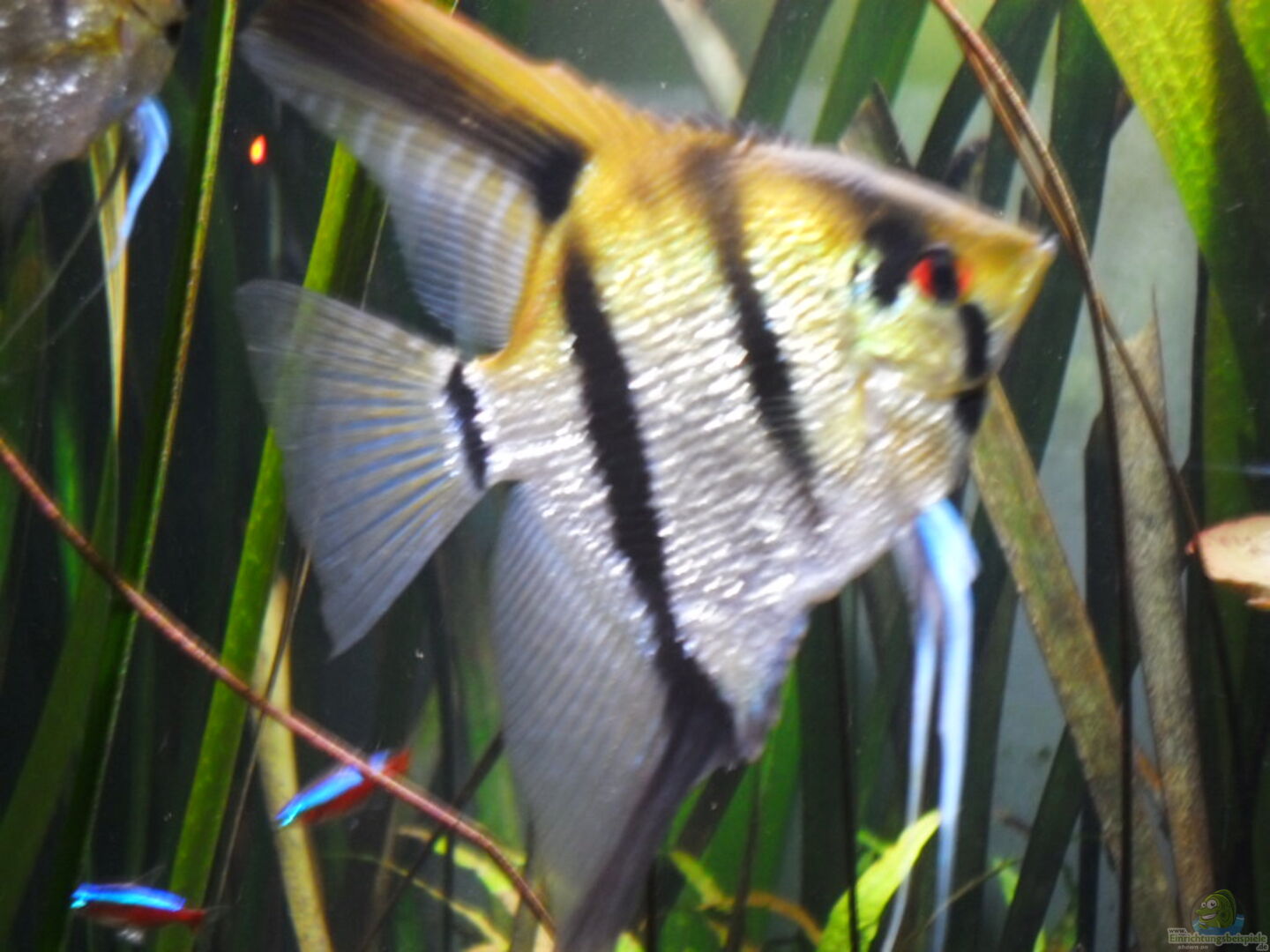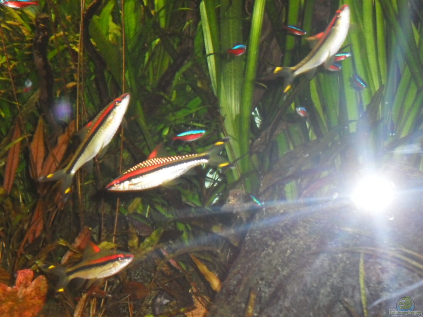 Vallisneria gigantea im Hintergrund, 2x Microsorum pteropus ( Java-Farns ) auf einer Wurzel gebunden, Cryptocryne wendtii um die Wurzel herum platziert und in der Mitte eine Nymphaea lotus die bis an die Wasseroberfläche gewachsen ist. Vorne links habe ich noch eine Echinodorus rigidifolius die aus dem Becken rausgewachsen ist.