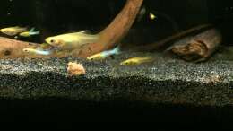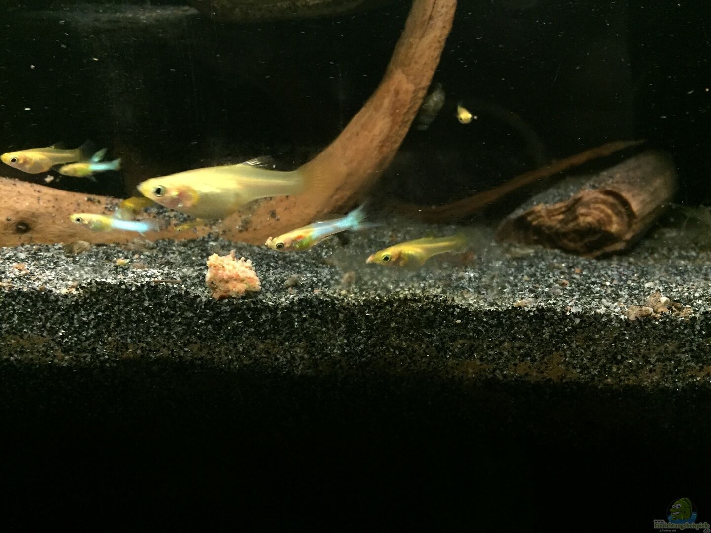 30+ Poecelia wingei (urspr. Japan blue jetzt eher blonde): Ursprünglich hatte ich hier 10 (8 w/2m) Japan Blue Endler eingesetzt, die seit etlichen Generationen in weichem Wasser gehalten wurden. Bei den neuen Jungfischen waren immer wieder gelbe Jungfische dabei. Da diese mir besonders gut gefallen haben, habe ich diese separat gesetzt und miteinander verpaart. Bei gelben Elterntieren kamen auch immer ausschlie??lich gelbe Jungfische zur Welt ... hätte eigentlich damit gerechnet, dass auch mal ein paar Japan Blue dabei sind, aber das ist nie passiert. Auch stellten sich die gelben Jungfische als deutlich robuster heraus als die grauen. Inzwischen haben die gelben Endler die Japan Blue bis auf 2 Exemplare komplett verdrängt.