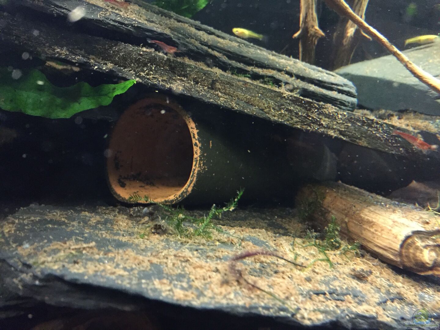 Das Becken wurde eher nach praktischen Gesichtspunkten gestaltet als nach optischen. Der Aufbau umfasst den kompletten Hintergrund und besteht aus Schieferplatten, Moorkienholz- und Keramikhöhlen sowie Moorkienholzstücken. Hinzu kommen Seemandelbaumblätter, Buchen- und Eichenlaub sowie Erlenzapfen. Das Ziel war es vielfältige Rückzugsräume für meine L397 und Rotpunktancistren zu schaffen.