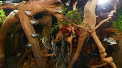 Gro??e Moorkienwurzeln von Patrick Eggelmann (Aquarium Wurzel Paradies), die ich, bewaffnet mit einem Zollstock, vor Ort ausgesucht habe. Einige Wurzeln hängen von oben ins Becken, andere stehen auf dem Boden und reichen bis an die Wasseroberfläche.