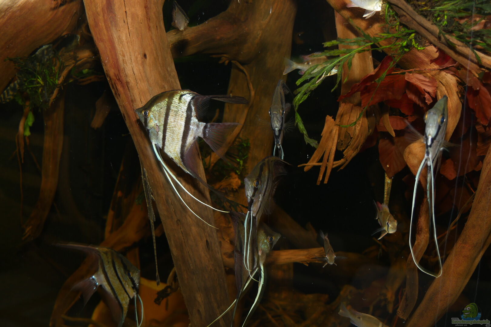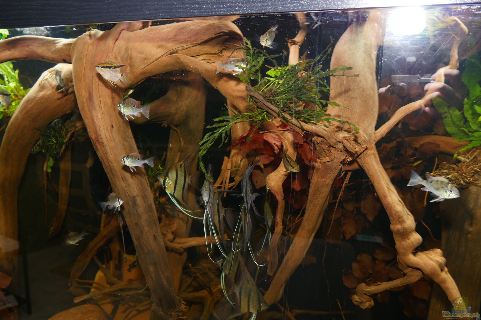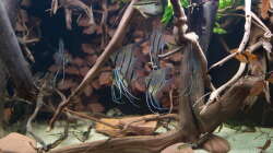 Das Becken gibt es noch mit der gleichen Einrichtung, allerdings ist der Besatz aus einem anderen Becken (Halbwildes Volk im Wurzeldickicht) aus Diskus, Mikrogeophagus und Cleithracara nebst Rotkopfsalmlern, Corydoras und L134 hier eingezogen.