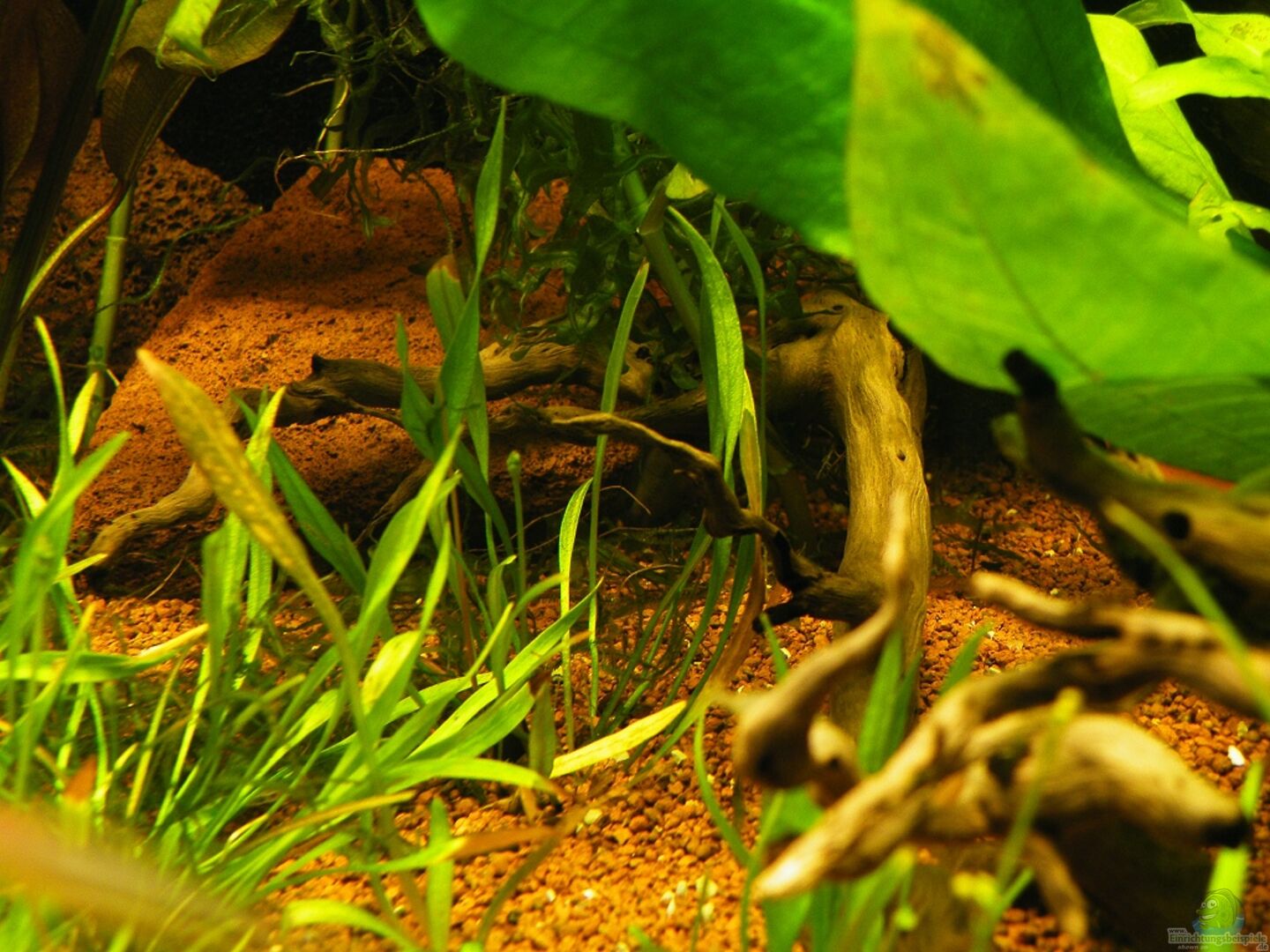 Gestern habe ich noch zwei Wurzeln ins Becken gebracht. Ansonsten passt alles soweit und ich hoffe, dass die E. tenellus nun kräftiger los legen. Immerhin entwickeln sich mittlerweile schon submerse Blätter.