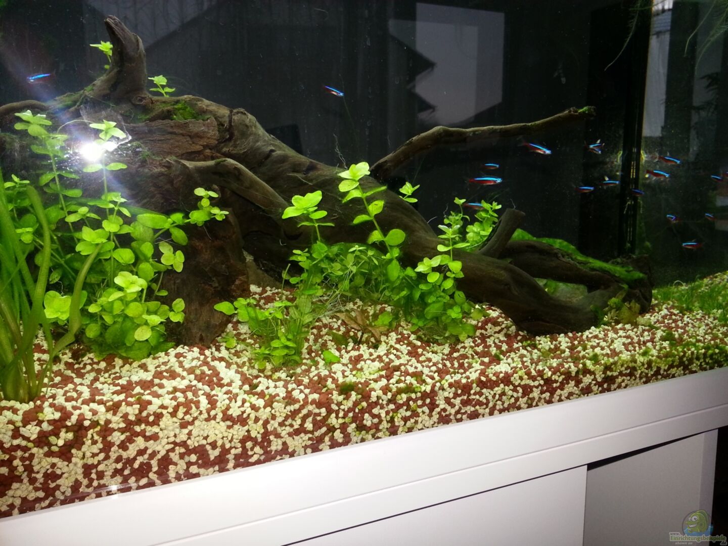 Fische fühlen sich wohl und sind wieder Aktiver. Neons schwimmen durch die Schwimmpflanzen nun weiter an der Oberfläche. Hoffe Algen werden weniger oder kommer gar nicht mehr.