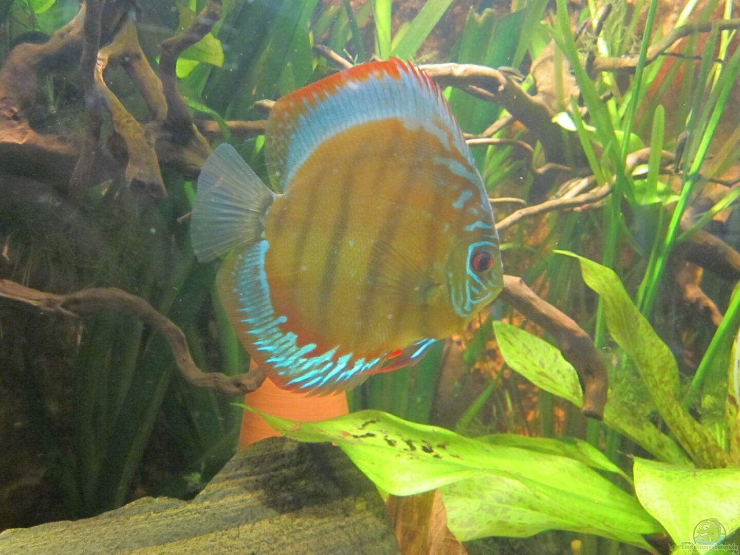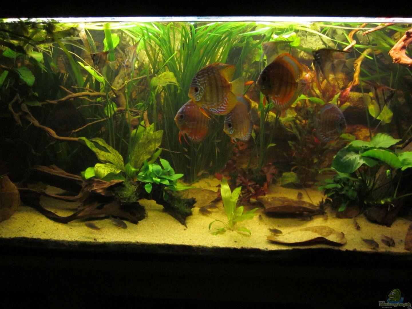 Die Stimmung der Diskusfische hat sich wieder gebessert. Viele kleine Wasserwechsel und eine kleine Umgestaltung inklusive des Entfernes von ein bis zwei schlecht richenden Wurzel hat sichtlich Besserung gebracht.