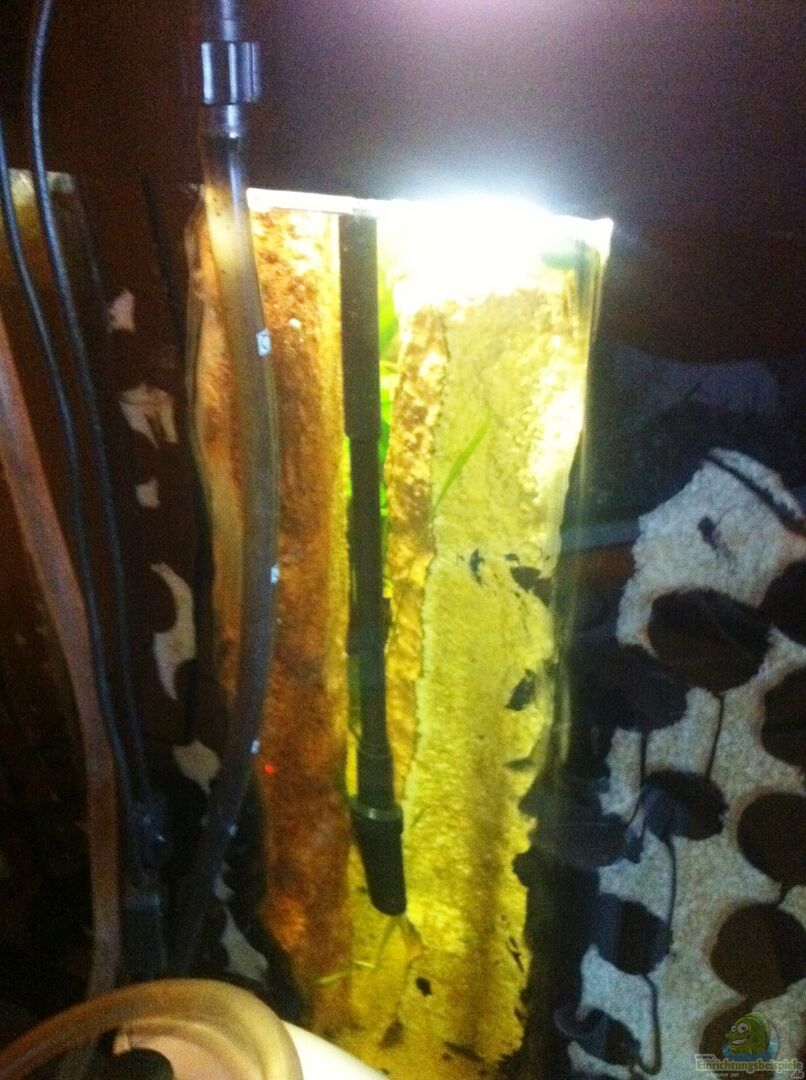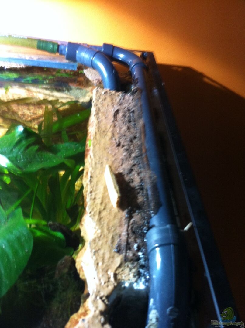 1x HMF (Matte 70x50) in gebogener Form hinter der Rückwand eingebracht und mit zugeschnittenen Kabelschächten befestigt. Mit Wasser wird die Matte versorgt durch eine kleine ??ffnung am unteren linken Teil der Rückwand, welcher von einer Schlucht verdeckt wird. Dort wurde ein kreisrundes Loch ausgeschnitten und mit einem Küchensieb verkleidet. Das Wasser wird von 1x Eheim 1000-2000l Kreiselpumpe und 1x Sera 700l/h Kreiselpumpe, welche beide hinter der Matte angebracht wurden, angesogen und wiederum durch ein Leitungssystem, welches in der Rückwand eingebaut ist, an verschiedenen Stellen des AQ´s eingebracht.