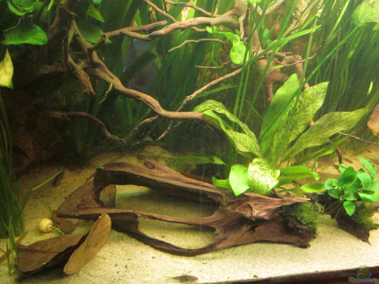 Und weiteres mal, aber ziemlich sicher zum letzten mal, hab ich Dekoration und Bepflanzung in "grö??erem" Ausma?? verändert. Eine gro??e Moorkinwurzel wurde entfernt, weil sie zuviel Platz beansprucht hat und als Lebensraum nicht wirklich aktzeptiert wurde. Ich hab sie durch eine von oben in das Becken hängende ersetzt. Diese ist eher feingliedrig im Vergleich zu ihrem Vorgänger und spendet den Disken und Skalaren einen ersehnten weiteren Platz um unter zu stehen. Die neuen Fotos sind ebenfalls hochgeladen und ersetzen die "alten".