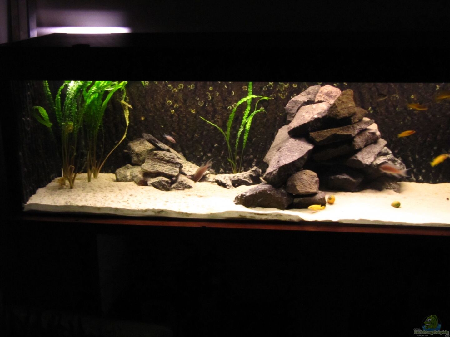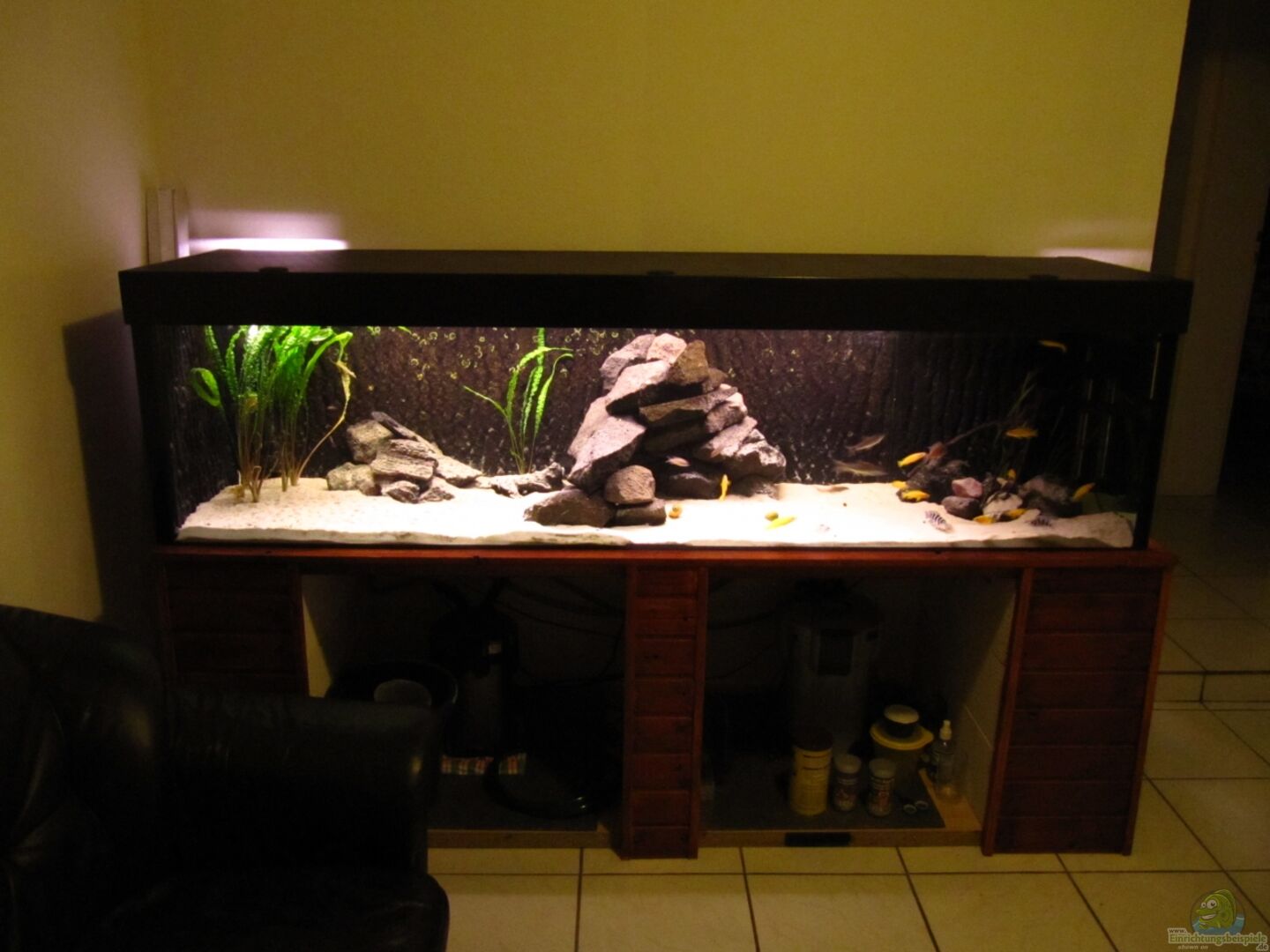 Ich stelle euch hier mein Lake Tanganjika 500 l Aquarium vor! Das Aquarium wurde vom Aquarien Bauer (André Geschwill) gefertigt und hat die masse 200 x 50 x 50 der Boden des Beckens besteht aus zwei teilen zur besseren Gewichtsverlagerung! Au??erdem ist das Becken an den Silikonnähten mit Glasstreifen geschützt! Das Untergestell ist eine eigen Konstruktion und besteht aus Ytong Steinen und einer Balkenkonstruktion als stütze! Als Auflage dienen zwei Küchenplatten die mit Holzlatten miteinander verbunden sind! Verkleidet ist das ganze Gestell mit Echt-Holz und in dunkel braunen Lack gestrichen! Als Türen dienen 2 Mdf Platten die Tapeziert und in Raumfarbe gestrichen worden sind! Ich hoffe euch gefällt mein kleiner See würde mich sehr über Kommentare und Anregungen freuen!!!