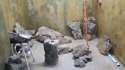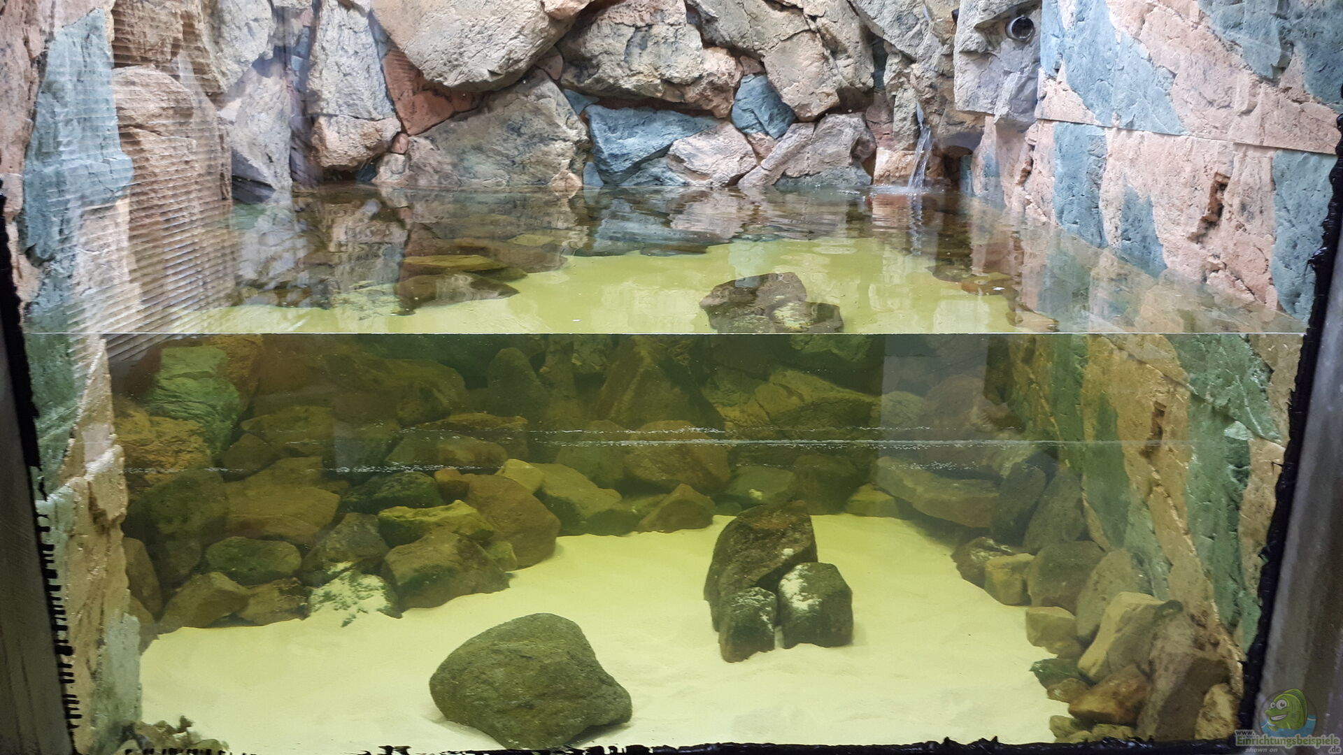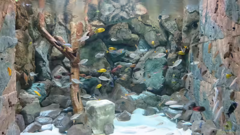 -Nachbildung des Tanganjika Biotop mit Steilwänden, Felsüberhängen, Geröll- und Sandzone