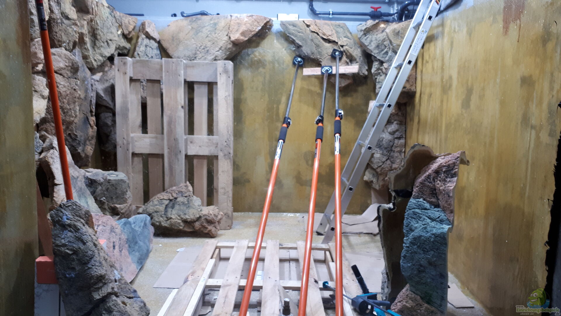 -Nur diese 3 Platten werden als Klebefäche für die Befestigung genutzt. Das hat den Vorteil, das die Steine gut vom Wasser durchströmt werden können und keine Gammelecken entstehen. Des weiteren, entstehen noch super Versteckplätze und Spalten für die Nachzuchten da alle Steine durch die Plexiglasstreifen etwa 3mm von der Wand abstehen