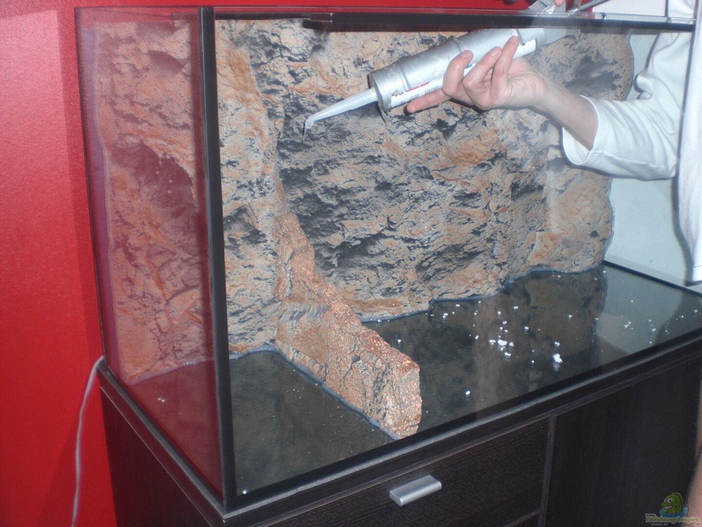 In die Rückwand habe ich einige Löcher (3mm bohrer) gebohrt und hinten ebenfalls mit Mattenfilter verklebt. Um einen Wasseraustausch hinter der Rückwand zu gewährleisten, habe ich eine Teichpumpe installiert (so, da?? ich diese auch rausnehmen kann und ggf. hinten auch mal absaugen kann).