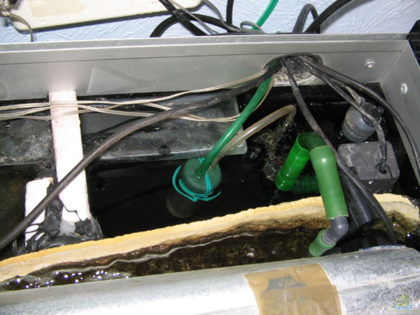 Schlammkammer, Aquariumwasser angesaugt von einer 1 Pumpe AquaClear70 mit 1500 L/h und über ein Rohrgestänge in die Biokammer weiter geleitet wird, was bestückt ist mit Filterschwamm