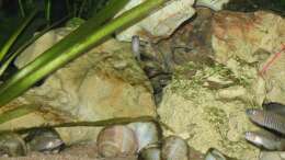 Die Rückwand habe ich mit ersteigert. Anfangs war ich unsicher, ob ich sie übernehmen soll, eben wegen der Wurzel. Da die Dinger aber so teuer sind, dachte ich, dass ich sie fürs erste übernehme. Mittlerweile gefällt sie mir aber recht gut, da die Wurzel auch einen prima Unterstand für die Paras abgibt und zudem das ganze Becken auflockert.
