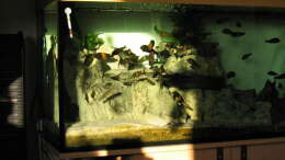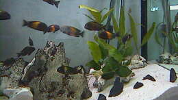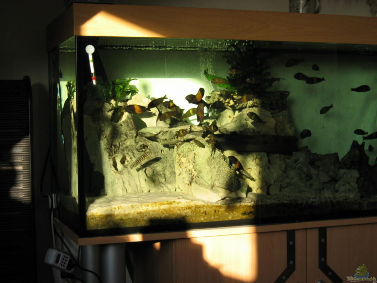 Die Einrichtung sieht gut aus. Der Standort sollte aber vor direktem Sonneneinfall geschützt sein. Die Beleuchtung ist viel zu hell für die Fische. Die Anzahl des Fischbesatzes dürfte aber nicht mehr steigen. Den Tropheus sollte pflanzliche Kost gereicht werden. ?berbrühter Biosalat, junge Spinatblätter Spinat und Gurke.