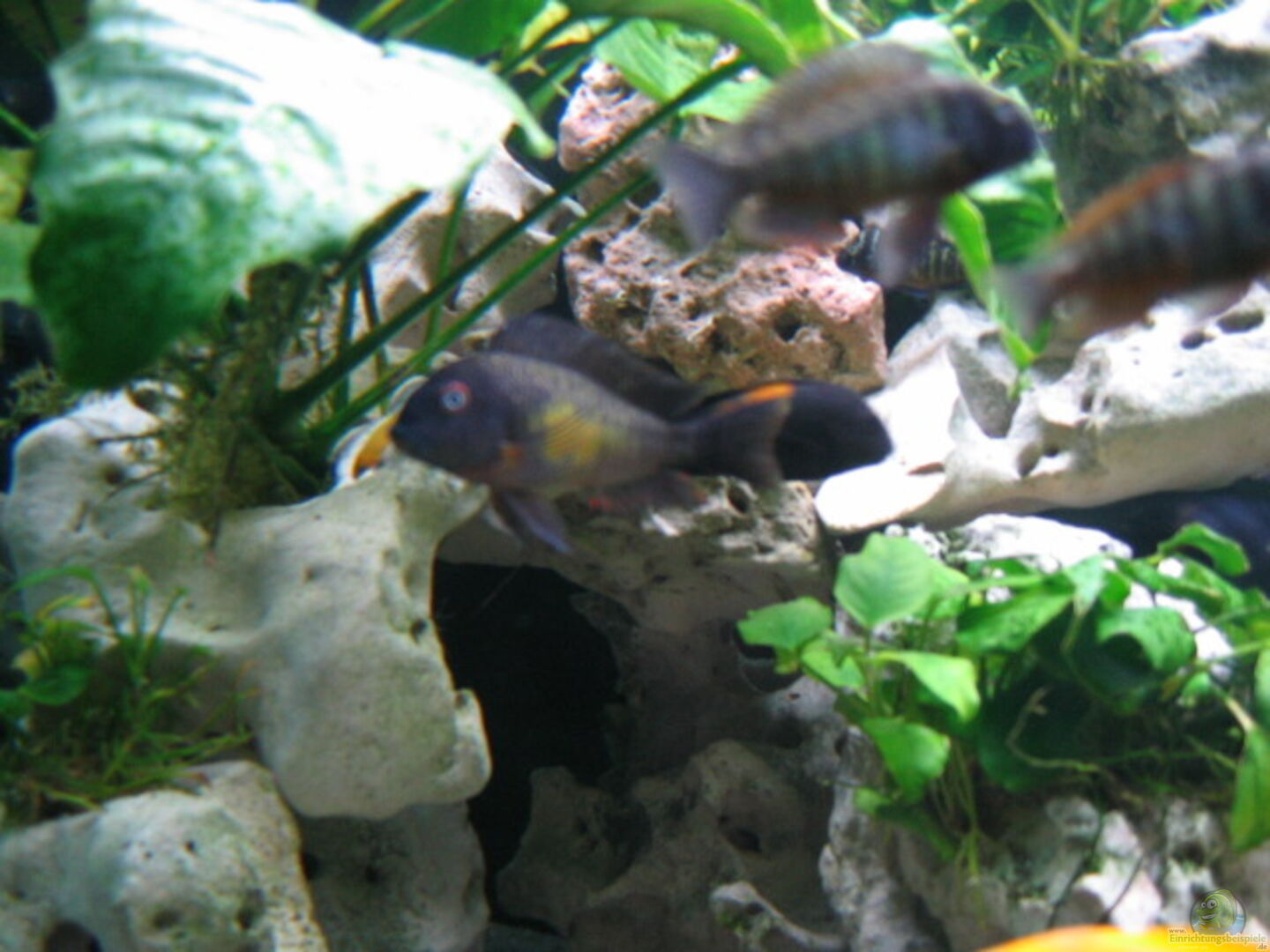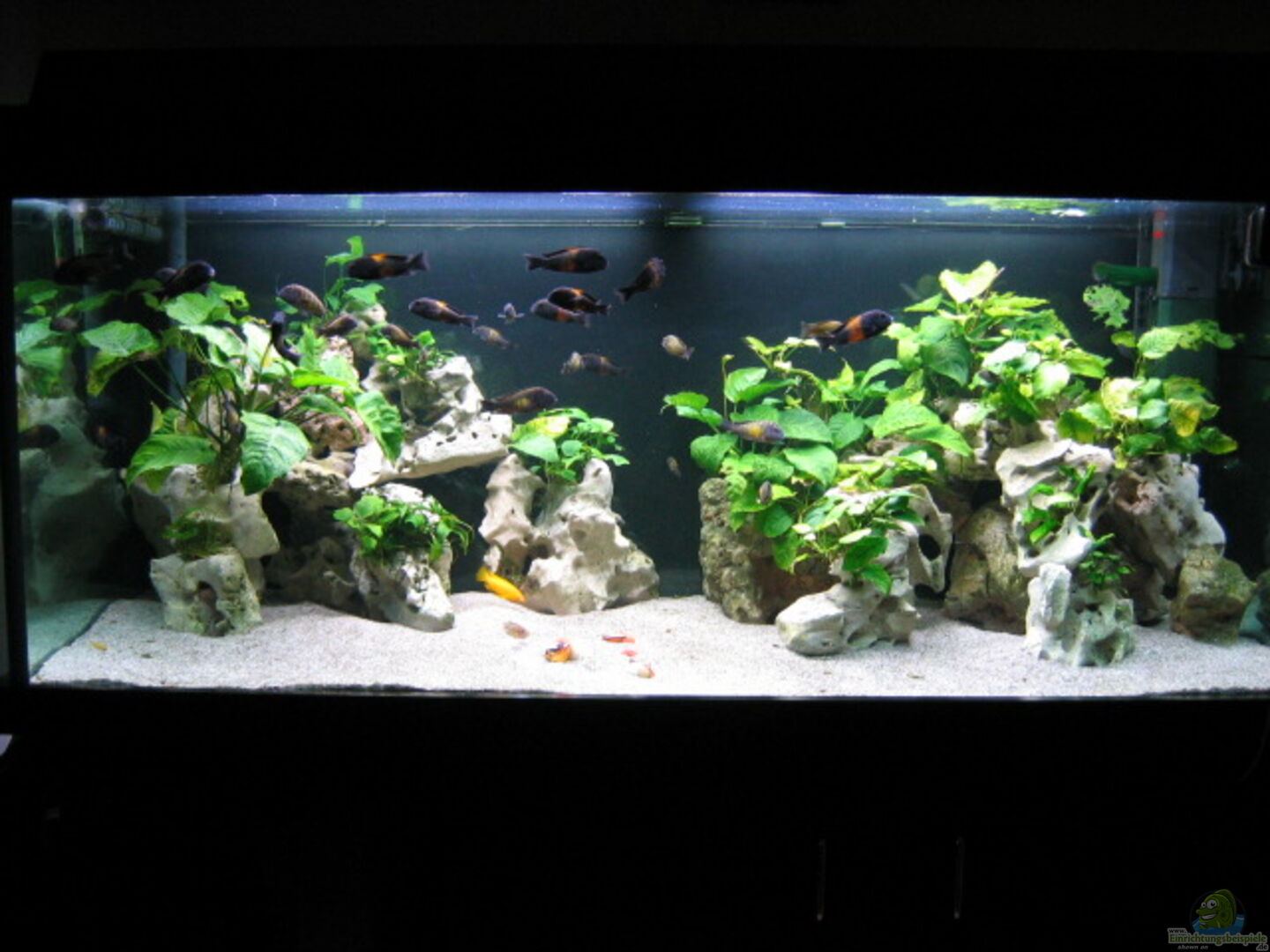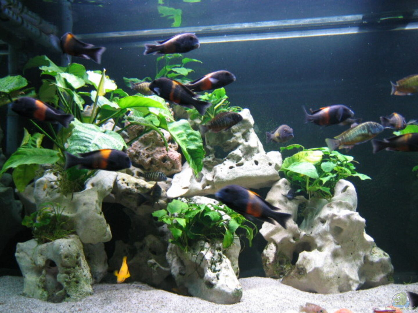 Insgesamt ein Becken, das einen optisch schönen Gesamteindruck vermittelt. Etwas zu dominant ist für mich das Blau der Rückwand. Eine andere Farbe (z.B. schwarz) würde m.M. die hübsche Lochgesteineinrichtung und natürlich die Fische wieder mehr in den Vordergrund rücken. Das Becken scheint au?erdem noch recht neu. Da werden sich die Zu- und Ablaufrohre zu den Au?enfiltern wahrscheinlich noch "von selbst" hinter den wachsenden Pflanzen verstecken.