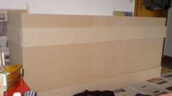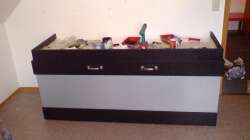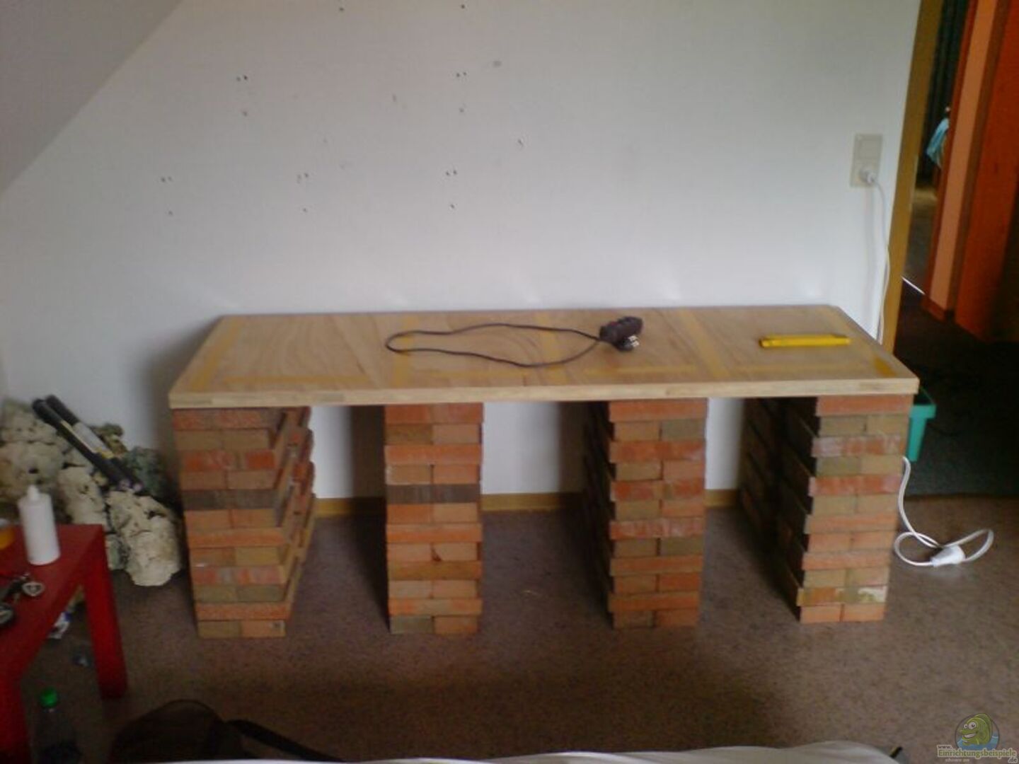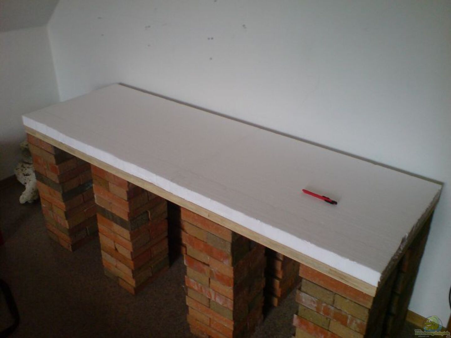 Das Becken und die Abdeckung habe ich bei Welskeller.de bestellt, noch mal ein gro??es ´Dankeschön´ an dieser Stelle. Der Unterbau ist alles in eigenregie entstanden. Als Säulen habe ich Ziegelsteine genommen. Insgesamt gibt es 8 Säulen, 4 vorne und 4 hinten. Zwischen Säulen und der darauf liegenden 5cm dicken Arbeitsplatte liegen noch dünne Schaumstoffmatten zum Druckausgleich. Auf der Arbeitsplatte liegen weitere 7cm dicke Styruporplatten zum weiteren Druckausgleich. Der ganze Unterbau ist mit lackierten Spanplatten verkleidet, die auf kleinen Rollen in einer Führungsschiene stehen. Somit kann ich die ganze Verkleidung vor ziehen (Wenn ich mal an die Eimer ran muss). Neben dem AQ steht noch ein kleiner Kasten in dem die ganze Technik zusammen läuft (auch unter ´Weitere Technik´ zu finden).