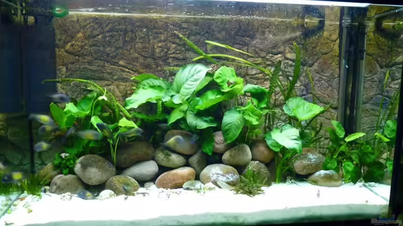 Es sollte genügend freier Schwimmraum vorhanden sein, dass hei??t es sollte genug Wasser pro Fisch, ca. 15 l, zur Verfügung stehen. Das kleinste, gerade noch geeignete Becken ist ein 300 Liter-Aquarium. Hier könnte eine Gruppe von 20 Tieren (gute Grundlage für einen Zuchtstamm) eingesetzt werden. Will man jedoch richtig Freude an seinen Tropheus haben, nimmt man besser eine Beckenlänge von 150 cm oder mehr und eine Tiefe von 50 oder 70 cm. Mein Becken ist 70 cm tief und lässt sich dadurch ganz anders gestalten. In einem Becken mit grö??erer Grundfläche ist damit auch Platz für mehr Versteckplätze und Reviere.