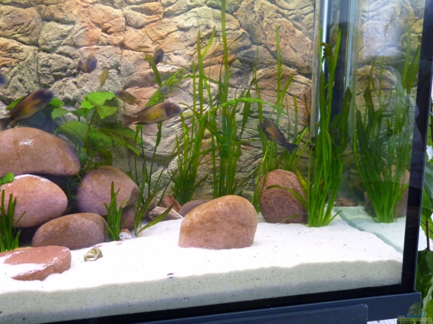 Als Bodengrund hat sich im Laufe der Jahre feiner Sand oder Kies mit einer Körnung von 2-3mm als das Optimale herausgestellt. Das bietet den Vorteil, dass sich die Exkremente der Fische darauf absetzen und vom Filter angesaugt werden bzw. beim Wasserwechsel mit dem Schlauch abgesaugt werden können. Kies, vor allem wenn es sehr grober ist, besitzt den Nachteil, dass sich eine mit viel Mulm durchsetzte Bodengrundmasse bildet, die sicherlich nicht dem Wunsch nach einem sauberen Becken nachkommt. Der Sand kann zusätzlich mit Muschelgru?? oder Korallenbruch vermengt werden um die Wasserwerte in Richtung Tanganjikasee zu bringen.