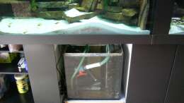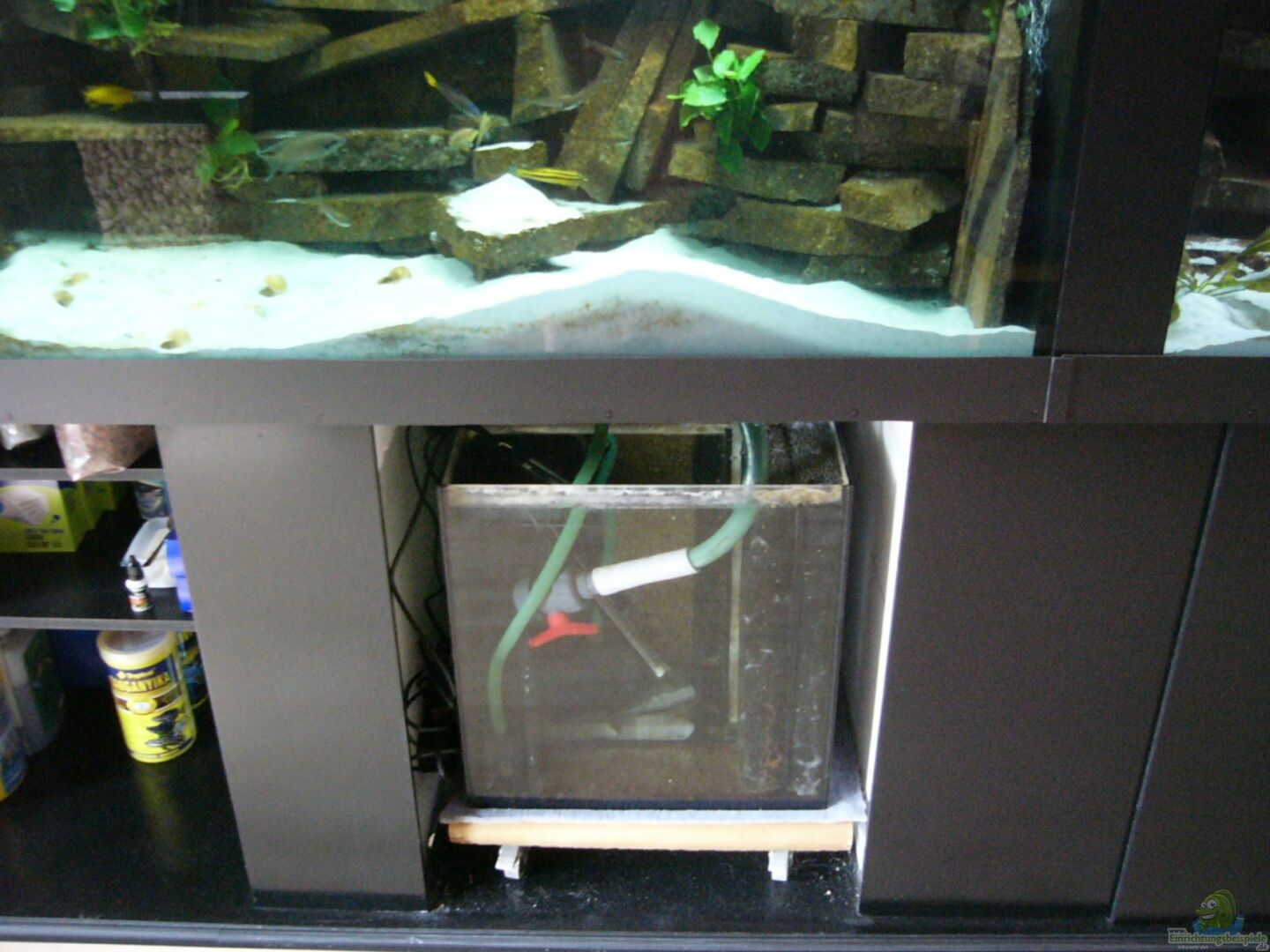 ??ber einen Rieselfilter läuft das Wasser in ein darunter liegenden selbst gebauten offenen Filter, dieser ist aus einem 100 Liter Würfelaquarium gebaut.