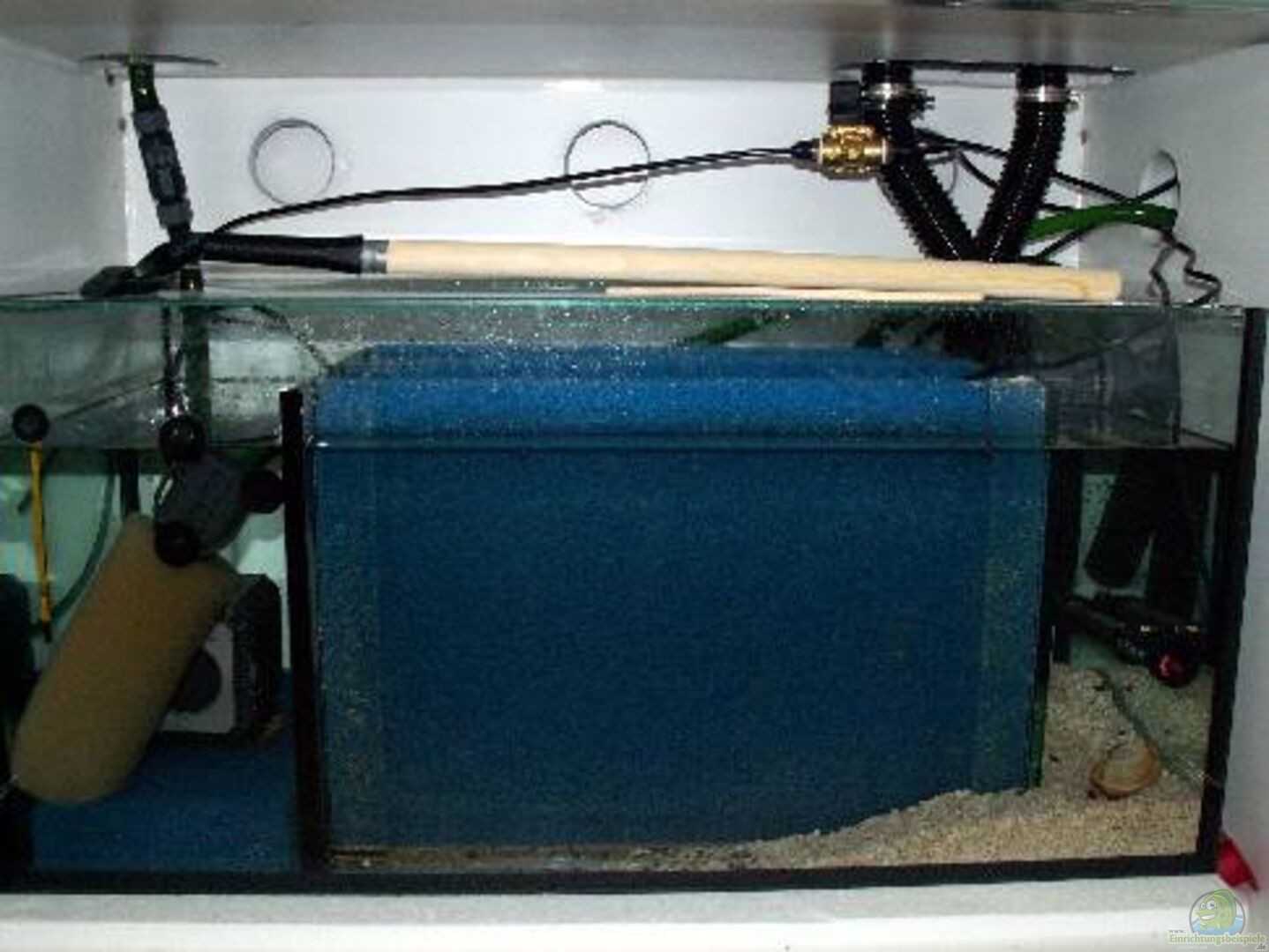 Gefiltert wird über einen externen ???Hamburger Mattenfilter???. Die Bemessung erfolgte nach der bekannten Internetseite von Olaf Deters. Das Filterbecken (80*45*40) steht im Unterschrank und wird von einer Eheim Pumpe (brutto 3400l/h => netto gut 2000l/h) betrieben. Der Zulauf erfolgt über zwei Tunze-Abläufe, der Rücklauf über eine PVC Verrohrung und der Einlauf ins Aquarium erfolgt über dem Wasserspiegel.