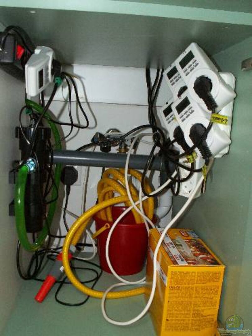 ??ber das Filterbecken wird auch der automatisierte Wasserwechsel betrieben. Unter dem Becken hinter dem Unterschrank ist ein Wasserzu- und Ablauf angebracht. Der Zulauf ist über einen 4/6 Schlauch und ein zeitgesteuertes Magnetventil mit dem Reinwasserbereich des Filterbeckens verbunden. So werden vier mal täglich ca. 10 Liter Wasser automatisch zugeführt. Die Wassermenge kann einfach über die Zeitschaltuhr gesteuert werden. Das überschüssige Wasser läuft über das Filterbecken (schmutzwasserseitig) ab.