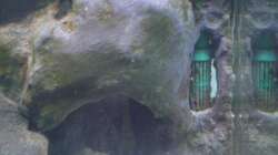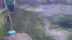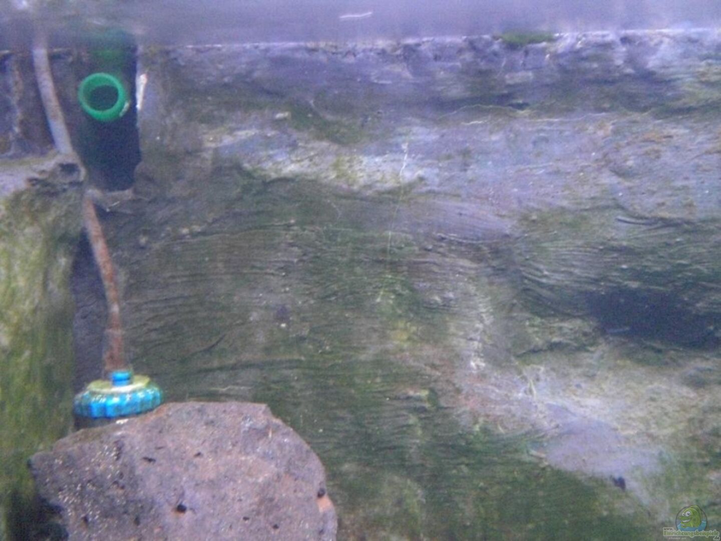 Selbst gebaute Rück und Seitenwand aus Styropor und eingefärbtem Zement mit integrierten Höhlen. Auslass und Ansaugvorrichtung sind kaum noch sichtbar
