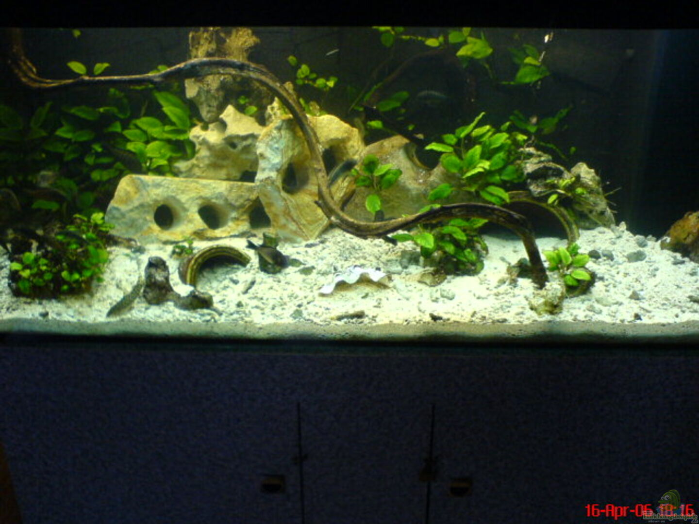 Sehr schön eingerichtet. Die Wurzel ist aber in der Tat zu groß, wird sich negativ auf die Wasserwerte auswirken. Was die Schmerle betrifft würd ich mal abwarten. Hatte 4 Prachtschmerle 5 Jahre lang in einem Malawibecken und die haben das 'Ostafrikanische' Wasser auch vetragen.