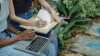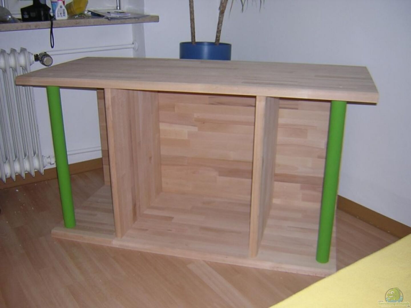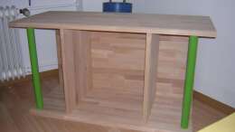 Selbst gebauter Unterschrank; 2 Arbeitsplatten 2600 x 600 x 37 mm, 2 Rundholzstäbe d45mm, viele Spax, grüne Farbe (passend zur gegenüberliegenden Wand), Kronengrund und Parkettlack zur Versiegelung;