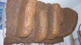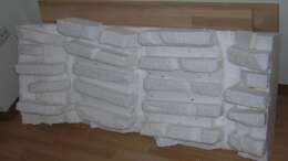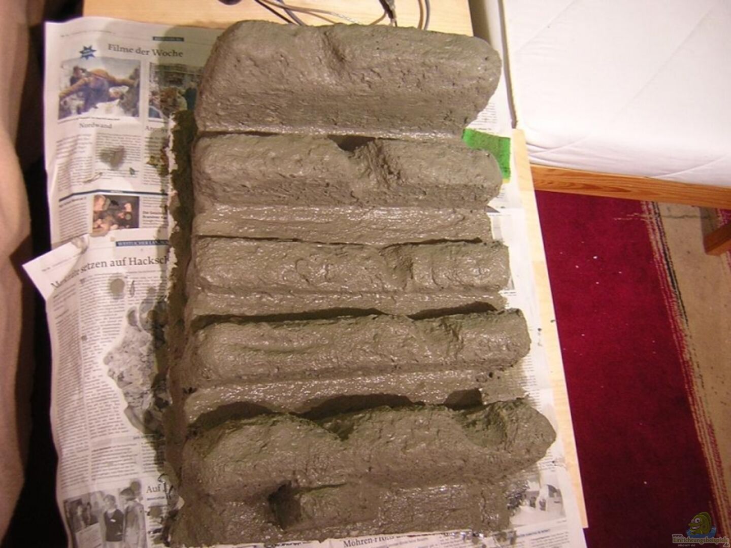 Selbstgebaute Rückwand, 4 Module; Grundform aus Styropor, Epoxidharz und Zement drüber, Abtönfarbe (3 verschiedene), mit Epoxydharz versiegelt, mit Sand bestreut; Das innere Styropor mit Hei??luftfön weggeschmolzen; So ergeben sich geräumige Filterkammern und viele Verstecke für Fische;