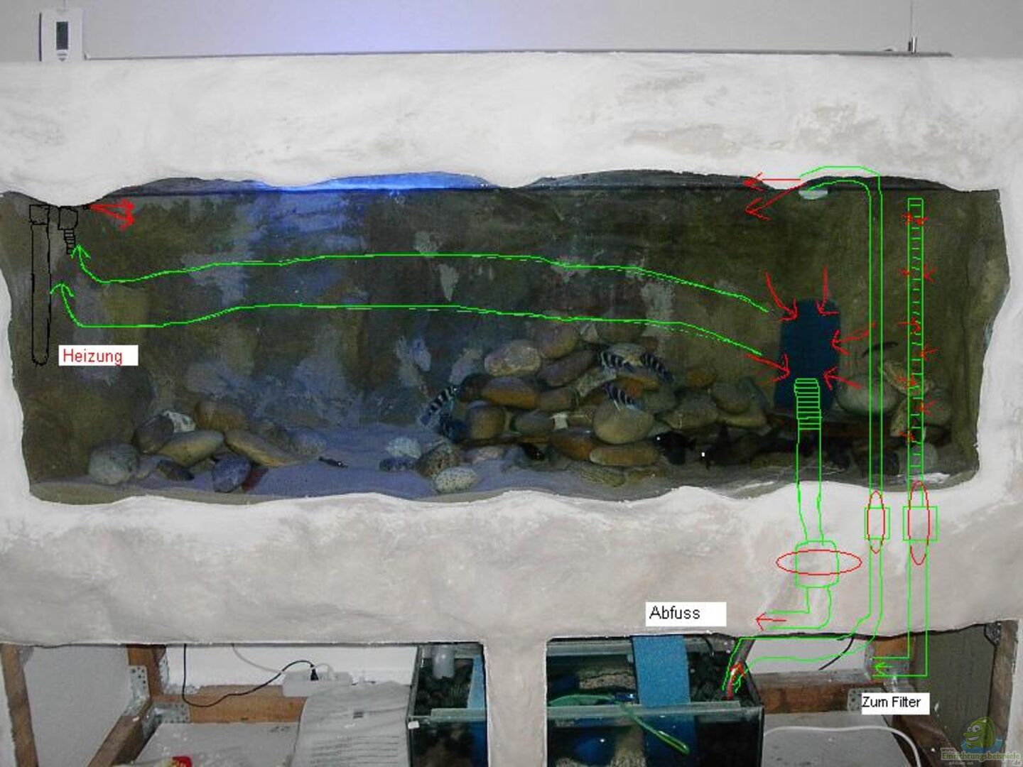 Rückwand selbst aus GFK laminiert und mit Sand-Harzgemisch bestrichen(Die hellen Stellen sind ausbesserungen nach dem letzten Umzug , werden sich mit der Zeit durch Algenbewuchs aber farblich anpassen).