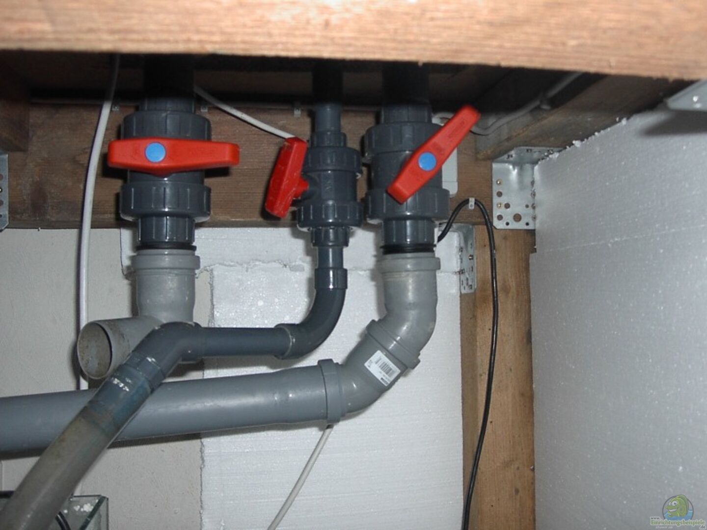 Wulstverklebt, Ablaufschacht hinten rechts, drei Bohrungen , zwei im Schacht : eine als Zulauf (25 mm Rohr), eine als Ablauf zum Filterbecken (40 mm Rohr), dritte neben Schacht im Becken zum Abflu??(40 mm Rohr Teilwasserwechsel, Entleerung).Feste Verrohrung mit Kugelhähnen.(siehe auch Bild unten)