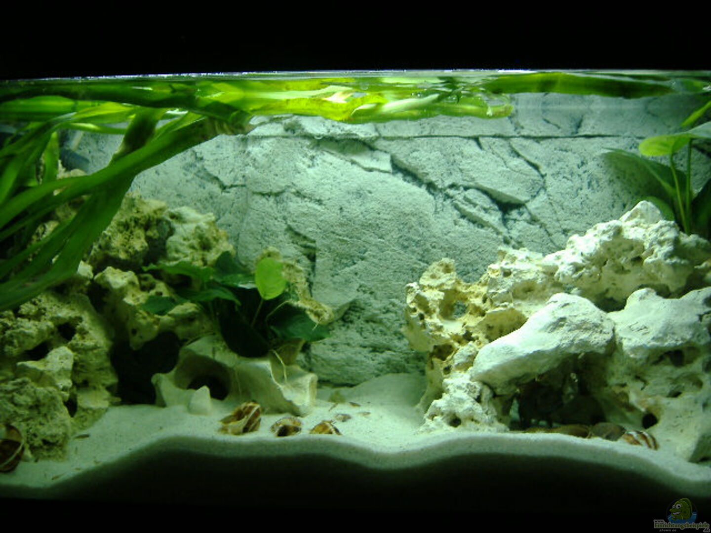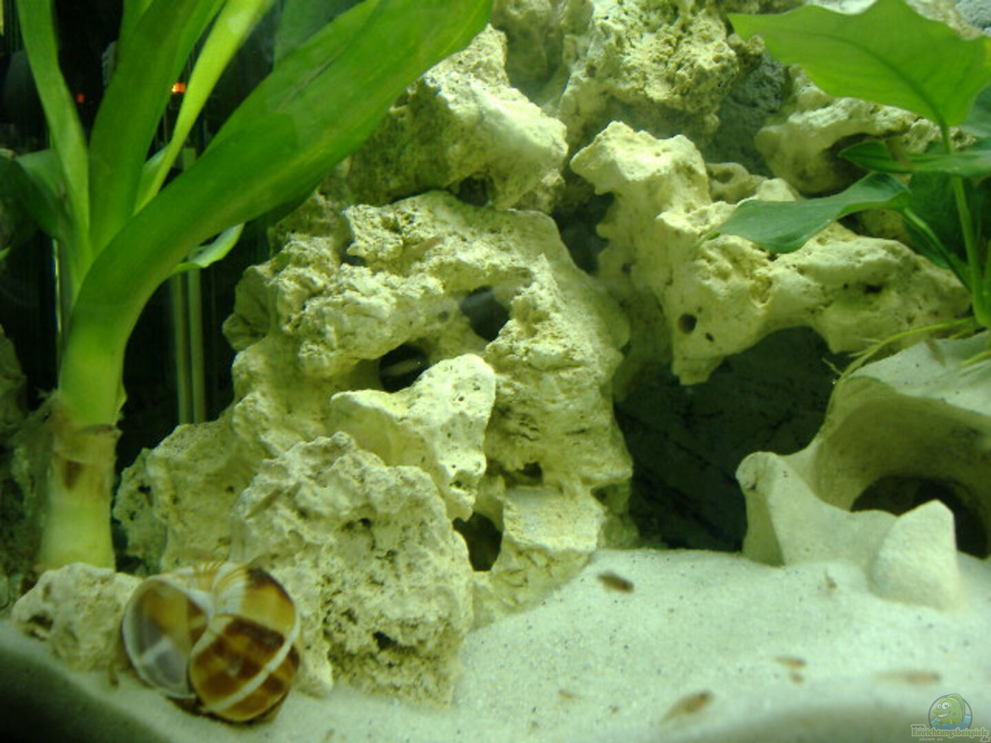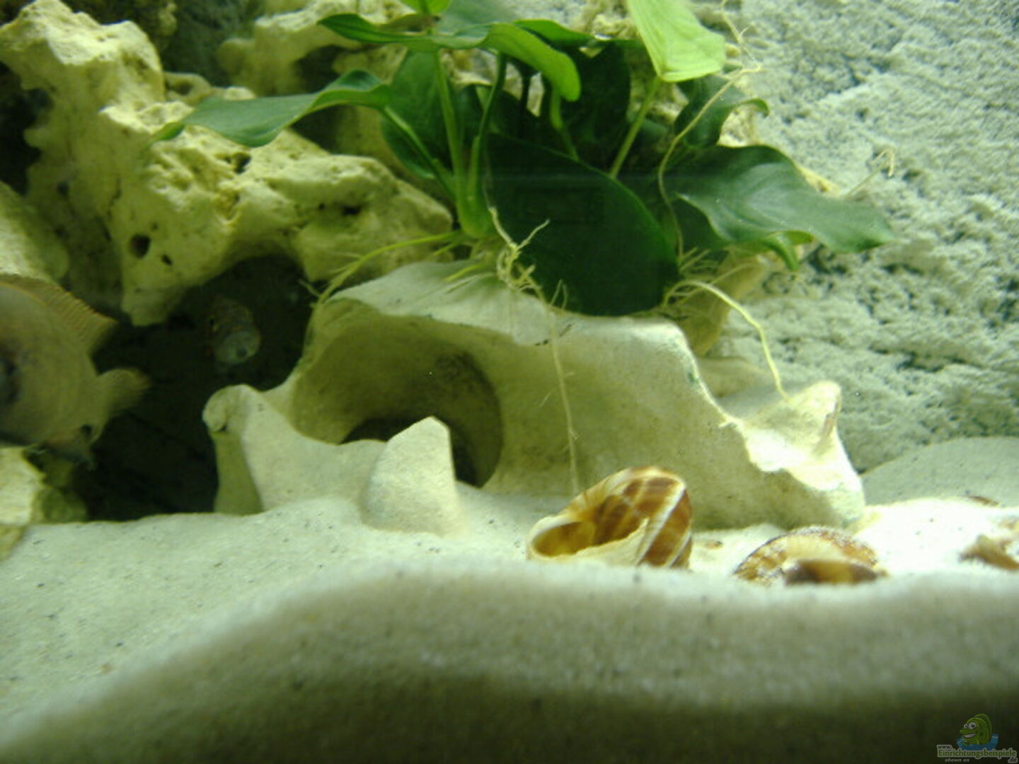 ca. 15 Kilo helles Lochgestein, aufgeschichtet zu zwei separaten Miniriffen, teilweise mit den Anubias bepflanzt (weil unsere Wühler die Pflanzen gerne ausgraben) Slimline Rückwand (heller Sandstein) von Back to Nature, 5 Weinbergschneckenhäuser, 2 Meeresschneckenhäuser