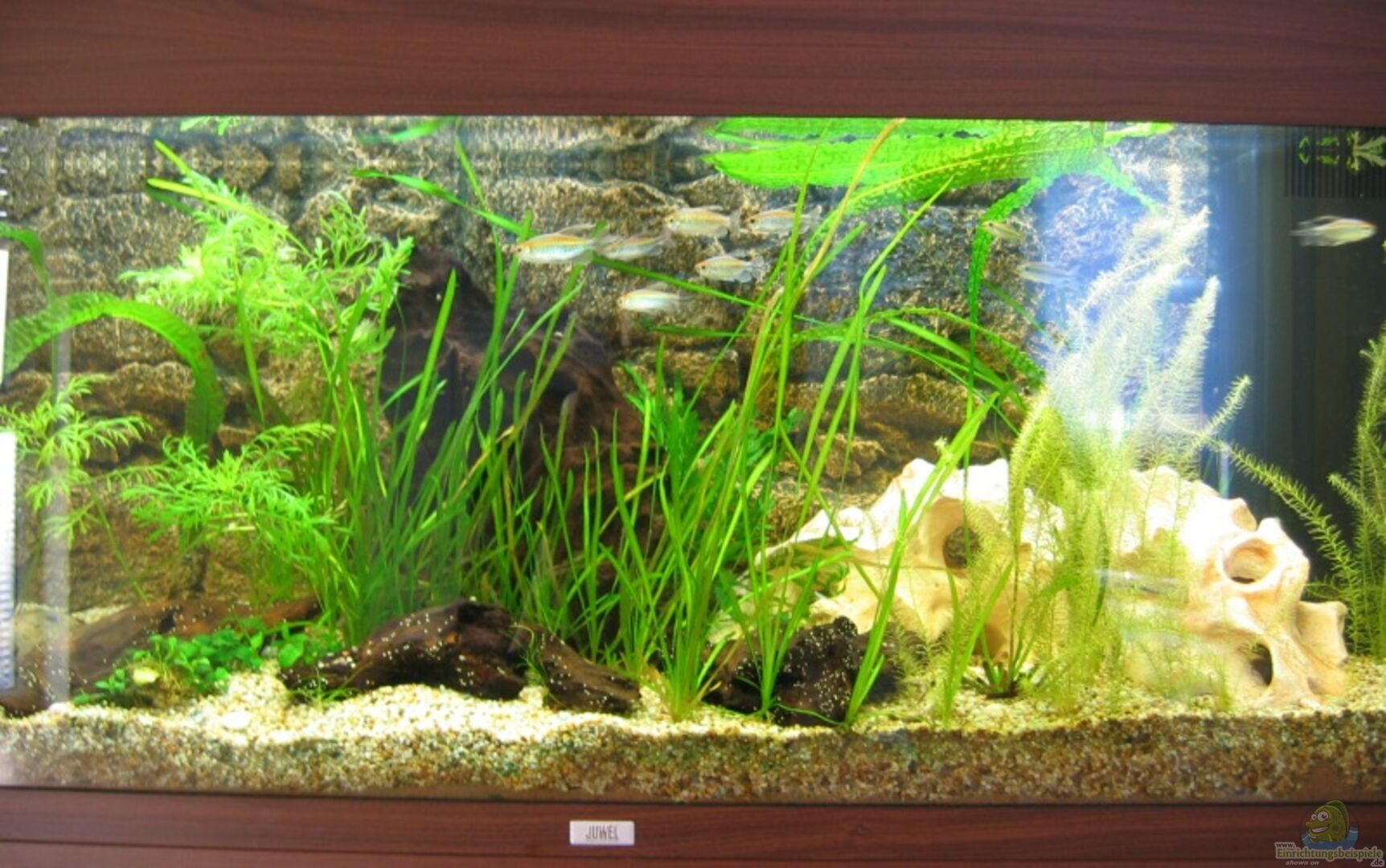 die Geschmäcker sind verschieden auch mich irritiert das Lochgestein. Ich finde die Temperatur auch mit 27 Grad etwas hoch, wenn Du die Heizung auf 24 Grad einstellst, dürftest Du Abends durch die Abwärme vom Licht 25-26 Grad haben. Du hättest auch einen grö?eren Puffer bei der Erwärmung durch die Sommerhitze. Ich kühle mit gro?en Eisbrocken aus dem Gefrierfach, allerdings kommt mein Wasser zu den Wasserwerten passend aus der Leitung und mache ab 28 Grad täglich kalte Wasserwechsel ( 30-40 Liter mit dem Aquriumwasser gie?e ich meine Balkonblumen). Ein paar mehr Pflanzen würden meiner Meinung nach nicht schaden.