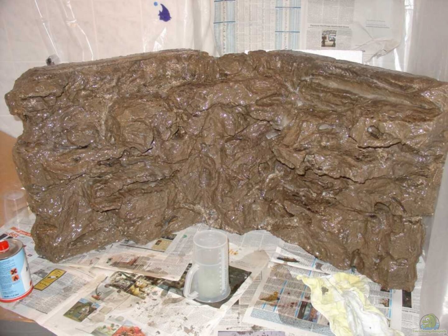 * Rückwand aus Styropor/Zement/Kunstharz mit mehreren Ebenen, Höhlen und Zu- und Ablauf
