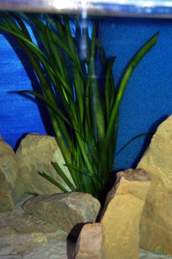 Im Au??enbereich des Mattenfilters steckt eine Grünlilie (Chlorophytum comosum), die ggf. Schadstoffe wie Nitrit aus dem Wasser ziehen soll.