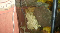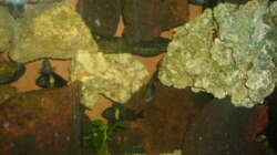 Statt einer rück-und seitenwand habe ich die wände miit gestein verkleidet , Diese habe ich im Becken so angeordnetdas sich viele Spalten und gro??e/kleine Höhlen ergeben .So können die Barsche Reviere abstecken und sich auch mal `aus dem Weg gehen.Auch der direkte Blickkontakt kann so vermieden werden. Da die Steine gleichzeitig aufgebaut sind, können sie schön durchschwommen werden.da das Gestein an der Rück , Seitenwände bis zur abgeckung gestapelt ist, Sieht man natürlich den Heizstab , Schläuche usw nicht. So habe ich auch asreichenden Schwimmraum geschaffen.