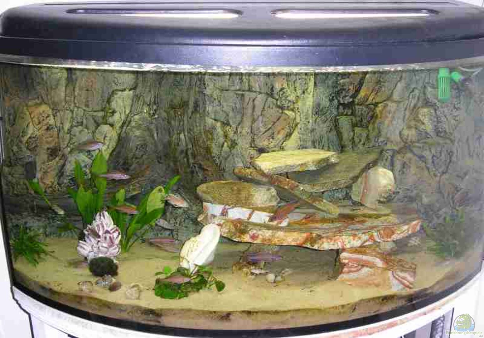 Schneckenhäuser für die Schneckenbuntbarsche, Rainbowschiefer, 3-D Rückwand mit Versteckmöglichkeiten und noch eine Seepocke damit sich die kleinen Baby-Fischies darin verstecken können. Ich wei?? dass die Pocke da eigentlich nicht reingehört, aber die Altolamprlogus laichen da so oft ab, dass ich sie nicht rausnehmen mag.