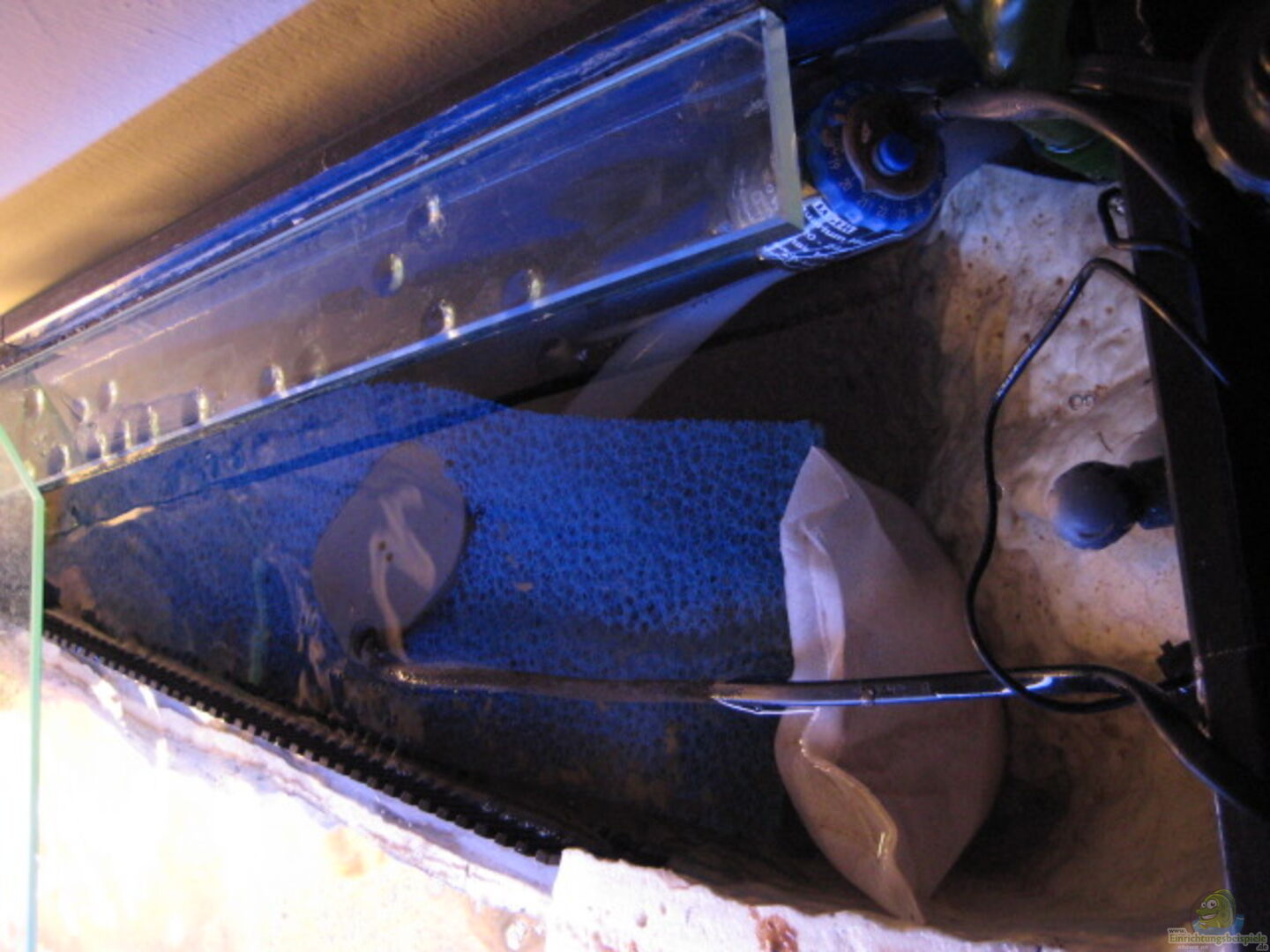 Eingebauter ??berlauf, Jäger 300W Heizstab und HMF in BTN-Modul H.Dieses ist auch zugeschnitten (etwas gekürzt und angepasst). Au??erdem habe ich in dieses Modul auch einen ??berlaufkamm geklebt, der den HMF mit Wasser versorgt. Der zweite Ansauger von meiner neuen Eheim prof.3 Pumpe ist am Grund des Moduls angebrach. Dieser sorgt für einen zusätzlichen duchsatz des HMF.