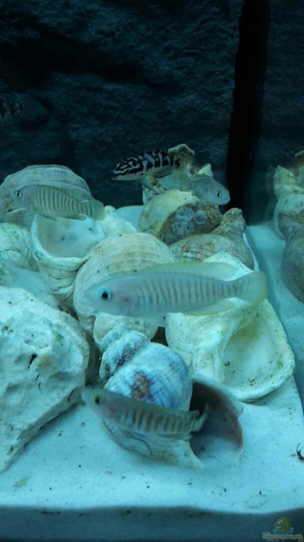 Die Multis sind heftig am Balzen. Die Weibchen, die jeweils ein Schneckenhaus als ihr Wohndomizil beanspruchen und sorgfältig pflegen (Algen und andere Verschmutzungen werden entfernt, die Häuser tiefer gelegt und mit einem Schutzwall umgeben) sind flei??ig am Graben, mit Maul und auch mit Körpereinsatz. Passiert diese das Männchen, wird es mit leichten Bissen und heftigem, ganzkörperlichen Vibrieren in das Schneckenhaus gelockt. Dort hinein verschwindet es dann für einige Sekunden mit dem Weibchen. Je williger die Weibchen sind, desto dunkler färben sie sich - das Männchen bleibt kontinuierlich hell. Ich konnte eine zunehmende Aggressivität unter den Weibchen beobachten.
