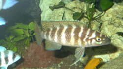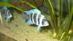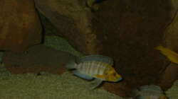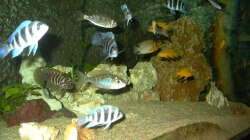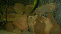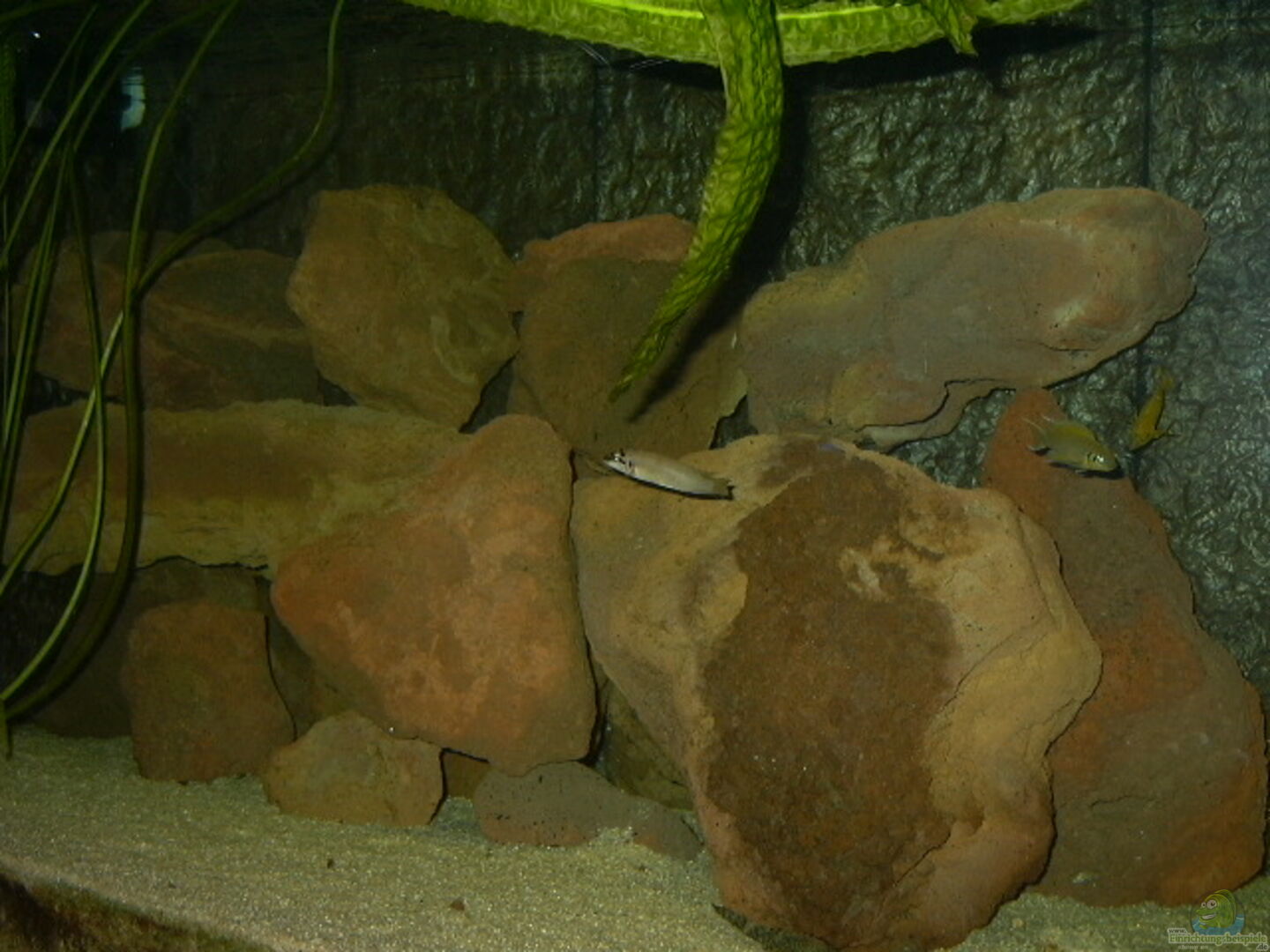 Steinaufbauten befinden sich an den beiden Enden des Aquariums, um in der Mitte viel freien Schwimmraum zur Verfügung zu stellen. Auf dem Boden in der Mitte sind verschiedene gro??e Schneckenhäuser verteilt.