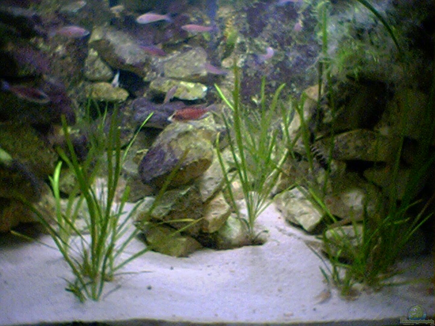 Vorne ist eine 30 cm tiefe Sandfläche mit einer Länge von 120 cm für die Xenos angelegt, die durch Vallisnerien in 3 Bereiche eingeteilt ist und an der ´Geröllzunge´ besteht auf der rechten Seite noch eine kleine Sandfläche um den Xenos genügend optionen für Reviere zu bieten.